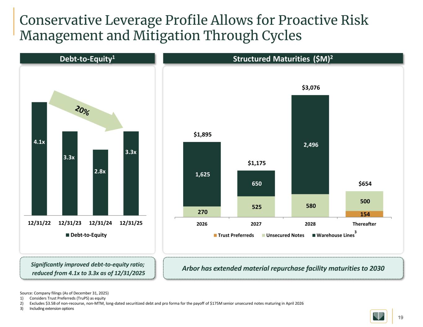 18 Highly Diversified Capital Structure Source: Company-provided information 1) Amounts are as of December 31, 2025 2) Excludes Agency debt due to its short-term nature 3) Pro forma for the payoff of $175M senior unsecured notes maturing in April 2026 Trust preferred (TruPS) Warehouse & repo Perpetual preferred equity Senior unsecured notes Common equity Collateralized loan obligations BTR securitization CLO repurchase facility 1 Total Enterprise Value = Diversity of funding options provides Arbor with financial flexibility and enables the Company to adapt to changing market conditions and mitigate risk Extensive experience with CRE CLOs 2 outstanding legacy nonrecourse CLOs totaling ~$2B; 1.97% over SOFR; 72% leverage 1 new $1.1B nonrecourse CLO (CLO 20); 1.82% over SOFR; 89% leverage; 2.5-year replenishment Match-funded with locked-in spreads Wtd. average advance rate of 77% 15 separate warehouse and repo facilities ($6.2B committed) 2 6.86% wtd. average coupon rate, no significant covenants; matures in 2026-2030 3 ~30 year unsecured with no significant covenants – equity-like $427M, 6.25% rate; $230M, 6.375% rate New CLO-like $1.2B repurchase facility used to unwind 2 CLO vehicles in full 1.85% over SOFR; 80% leverage; 88% non-recourse New BTR CLO, improved terms over our warehouse lines 80% leverage, 2-year replacement ~$8.3B secured indebtedness of which ~78% is non-recourse and ~54% is non-mark-to-market, non-recourse, long-dated securitized/CLO-like debt with average pricing of ~2.00% (w/o fees) over SOFR 2,433 154 657 1,875 3,618 1,153 525 2,961 13,376