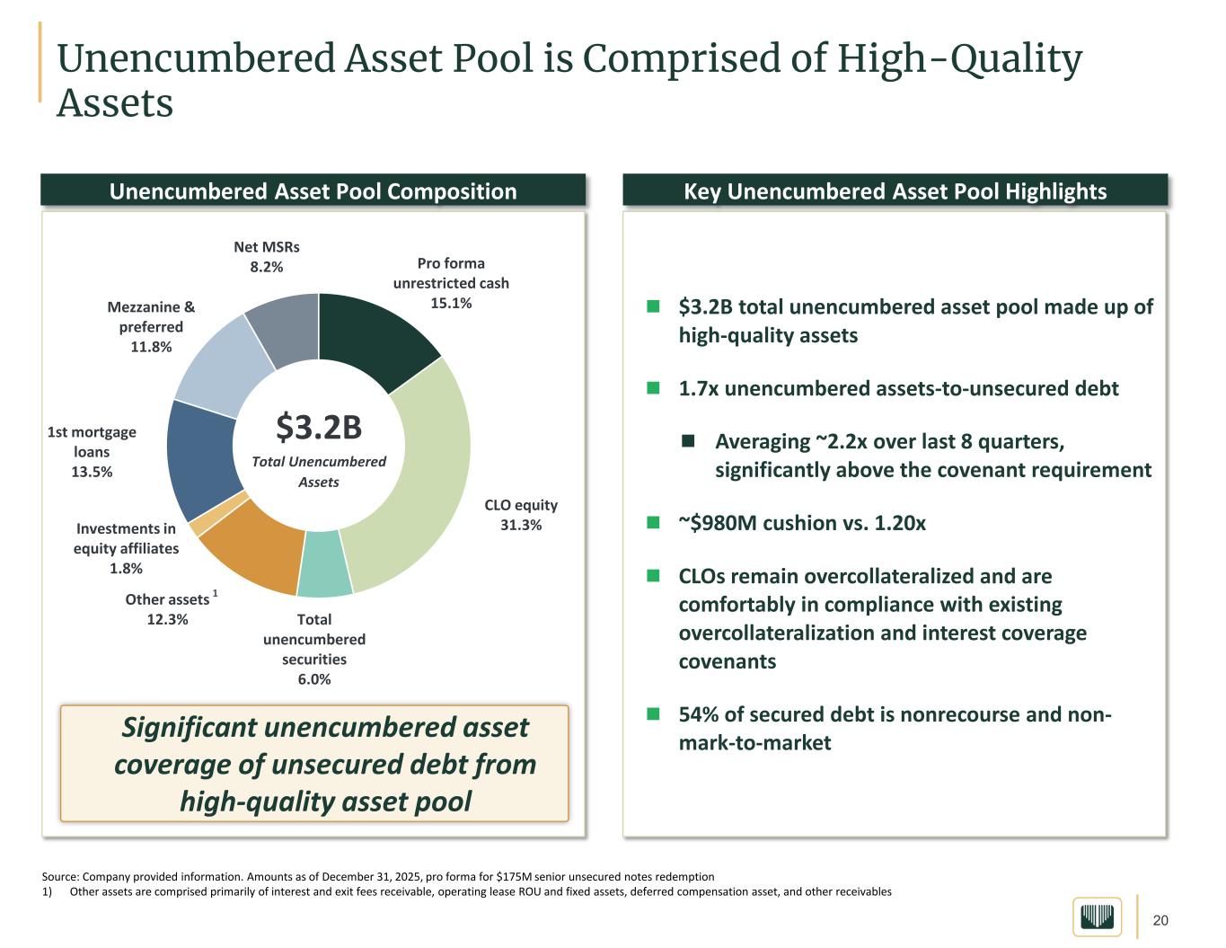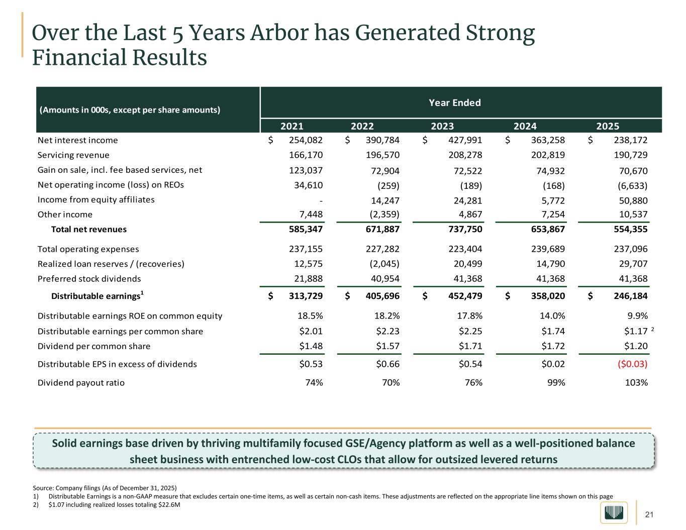 19 Conservative Leverage Profile Allows for Proactive Risk Management and Mitigation Through Cycles Source: Company filings (As of December 31, 2025) 1) Considers Trust Preferreds (TruPS) as equity 2) Excludes $3.5B of non-recourse, non-MTM, long-dated securitized debt and pro forma for the payoff of $175M senior unsecured notes maturing in April 2026 3) Including extension options Structured Maturities ($M)2Debt-to-Equity1 3 Significantly improved debt-to-equity ratio; reduced from 4.1x to 3.3x as of 12/31/2025 Arbor has extended material repurchase facility maturities to 2030 4.1x 3.3x 2.8x 3.3x 12/31/22 12/31/23 12/31/24 12/31/25 Debt-to-Equity 154 270 525 580 500 1,625 650 2,496 $1,895 $1,175 $3,076 $654 2026 2027 2028 Thereafter Trust Preferreds Unsecured Notes Warehouse Lines