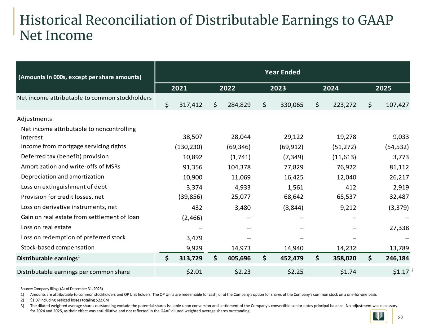 21 Over the Last 5 Years Arbor has Generated Strong Financial Results Source: Company filings (As of December 31, 2025) 1) Distributable Earnings is a non-GAAP measure that excludes certain one-time items, as well as certain non-cash items. These adjustments are reflected on the appropriate line items shown on this page 2) $1.07 including realized losses totaling $22.6M Solid earnings base driven by thriving multifamily focused GSE/Agency platform as well as a well-positioned balance sheet business with entrenched low-cost CLOs that allow for outsized levered returns Net interest income $ 254,082 $ 390,784 $ 427,991 $ 363,258 $ 238,172 Servicing revenue 166,170 196,570 208,278 202,819 190,729 Gain on sale, incl. fee based services, net 123,037 72,904 72,522 74,932 70,670 Net operating income (loss) on REOs 34,610 (259) (189) (168) (6,633) Income from equity affiliates - 14,247 24,281 5,772 50,880 Other income 7,448 (2,359) 4,867 7,254 10,537 Total net revenues 585,347 671,887 737,750 653,867 554,355 Total operating expenses 237,155 227,282 223,404 239,689 237,096 Realized loan reserves / (recoveries) 12,575 (2,045) 20,499 14,790 29,707 Preferred stock dividends 21,888 40,954 41,368 41,368 41,368 Distributable earnings1 $ 313,729 $ 405,696 $ 452,479 $ 358,020 $ 246,184 Distributable earnings ROE on common equity 18.5% 18.2% 17.8% 14.0% 9.9% Distributable earnings per common share $2.01 $2.23 $2.25 $1.74 $1.17 2 Dividend per common share $1.48 $1.57 $1.71 $1.72 $1.20 Distributable EPS in excess of dividends $0.53 $0.66 $0.54 $0.02 ($0.03) Dividend payout ratio 74% 70% 76% 99% 103% 2025 Year Ended 20242023 (Amounts in 000s, except per share amounts) 2021 2022