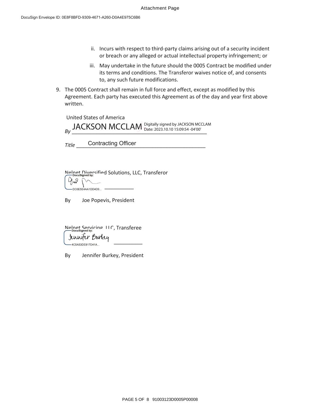 Attachment Page PAGE 5 OF 8 91003123D0005P00008 ii. Incurs with respect to third-party claims arising out of a security incident or breach or any alleged or actual intellectual property infringement; or iii. May undertake in the future should the 0005 Contract be modified under its terms and conditions. The Transferor waives notice of, and consents to, any such future modifications. 9. The 0005 Contract shall remain in full force and effect, except as modified by this Agreement. Each party has executed this Agreement as of the day and year first above written. United States of America By _______________________________________________ Title _____________________________________________ Nelnet Diversified Solutions, LLC, Transferor ________________________ By Joe Popevis, President Nelnet Servicing, LLC, Transferee ___________________________ By Jennifer Burkey, President Contracting Officer JACKSON MCCLAM Digitally signed by JACKSON MCCLAM Date: 2023.10.10 15:09:54 -04'00'