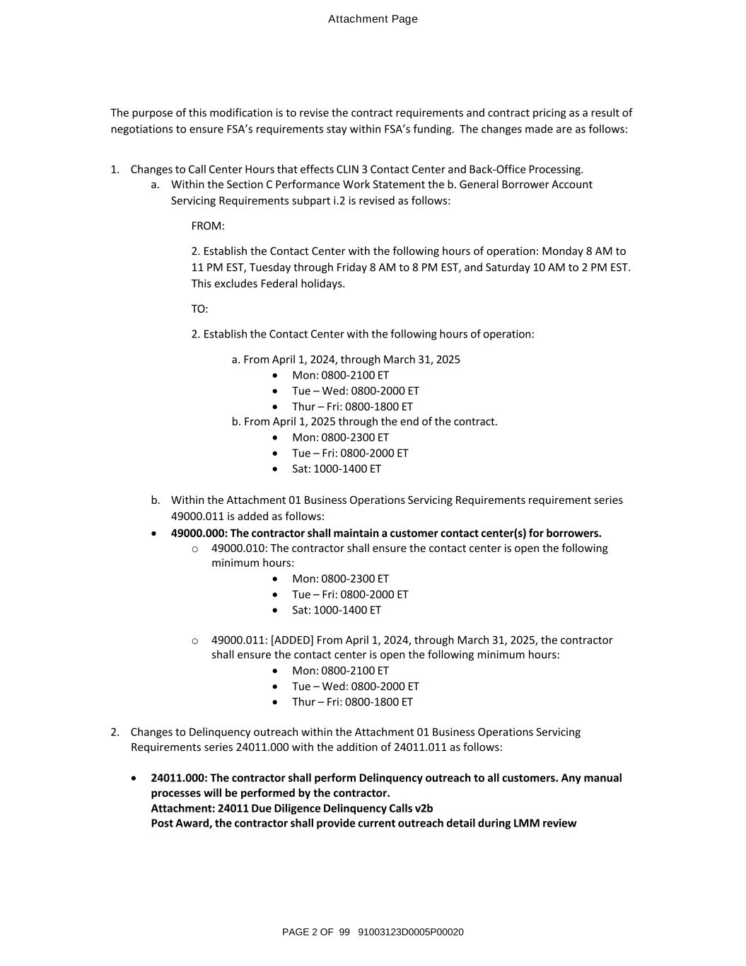 Attachment Page PAGE 2 OF 99 91003123D0005P00020 The purpose of this modification is to revise the contract requirements and contract pricing as a result of negotiations to ensure FSA’s requirements stay within FSA’s funding. The changes made are as follows: 1. Changes to Call Center Hours that effects CLIN 3 Contact Center and Back-Office Processing. a. Within the Section C Performance Work Statement the b. General Borrower Account Servicing Requirements subpart i.2 is revised as follows: FROM: 2. Establish the Contact Center with the following hours of operation: Monday 8 AM to 11 PM EST, Tuesday through Friday 8 AM to 8 PM EST, and Saturday 10 AM to 2 PM EST. This excludes Federal holidays. TO: 2. Establish the Contact Center with the following hours of operation: a. From April 1, 2024, through March 31, 2025 • Mon: 0800-2100 ET • Tue – Wed: 0800-2000 ET • Thur – Fri: 0800-1800 ET b. From April 1, 2025 through the end of the contract. • Mon: 0800-2300 ET • Tue – Fri: 0800-2000 ET • Sat: 1000-1400 ET b. Within the Attachment 01 Business Operations Servicing Requirements requirement series 49000.011 is added as follows: • 49000.000: The contractor shall maintain a customer contact center(s) for borrowers. o 49000.010: The contractor shall ensure the contact center is open the following minimum hours: • Mon: 0800-2300 ET • Tue – Fri: 0800-2000 ET • Sat: 1000-1400 ET o 49000.011: [ADDED] From April 1, 2024, through March 31, 2025, the contractor shall ensure the contact center is open the following minimum hours: • Mon: 0800-2100 ET • Tue – Wed: 0800-2000 ET • Thur – Fri: 0800-1800 ET 2. Changes to Delinquency outreach within the Attachment 01 Business Operations Servicing Requirements series 24011.000 with the addition of 24011.011 as follows: • 24011.000: The contractor shall perform Delinquency outreach to all customers. Any manual processes will be performed by the contractor. Attachment: 24011 Due Diligence Delinquency Calls v2b Post Award, the contractor shall provide current outreach detail during LMM review