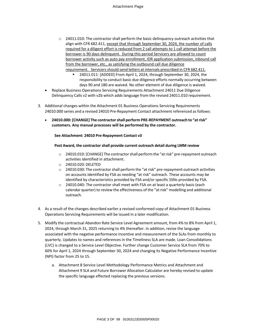 Attachment Page PAGE 3 OF 99 91003123D0005P00020 o 24011.010: The contractor shall perform the basic delinquency outreach activities that align with CFR 682.411, except that through September 30, 2024, the number of calls required for a diligent effort is reduced from 2 call attempts to 1 call attempt before the borrower is 90 days delinquent. During this period Servicers are allowed to count borrower activity such as auto pay enrollment, IDR application submission, inbound call from the borrower, etc., as satisfying the outbound call due diligence requirement. Servicers should send letters at intervals prescribed in CFR 682.411. 24011.011: [ADDED] From April 1, 2024, through September 30, 2024, the responsibility to conduct basic due diligence efforts normally occurring between days 90 and 180 are waived. No other element of due diligence is waived. • Replace Business Operations Servicing Requirements Attachment 24011 Due Diligence Delinquency Calls v2 with v2b which adds language from the revised 24011.010 requirement. 3. Additional changes within the Attachment 01 Business Operations Servicing Requirements 24010.000 series and a revised 24010 Pre-Repayment Contact attachment referenced as follows: • 24010.000: [CHANGE] The contractor shall perform PRE-REPAYMENT outreach to “at risk” customers. Any manual processes will be performed by the contractor. See Attachment: 24010 Pre-Repayment Contact v3 Post Award, the contractor shall provide current outreach detail during LMM review o 24010.010: [CHANGE] The contractor shall perform the “at risk” pre-repayment outreach activities identified in attachment. o 24010.020: DELETED o 24010.030: The contractor shall perform the “at risk” pre-repayment outreach activities on accounts identified by FSA as needing “at risk” outreach. These accounts may be identified by characteristics provided by FSA and/or specific SSNs provided by FSA. o 24010.040: The contractor shall meet with FSA on at least a quarterly basis (each calendar quarter) to review the effectiveness of the “at risk” modelling and additional outreach. 4. As a result of the changes described earlier a revised conformed copy of Attachment 01 Business Operations Servicing Requirements will be issued in a later modification. 5. Modify the contractual Abandon Rate Service Level Agreement amount, from 4% to 8% from April 1, 2024, through March 31, 2025 returning to 4% thereafter. In addition, revise the language associated with the negative performance incentive and measurement of the SLAs from monthly to quarterly. Updates to names and references in the Timeliness SLA are made. Loan Consolidations (LVC) is changed to a Service Level Objective. Further change Customer Service SLA from 70% to 60% for April 1, 2024 through September 30, 2024 and changing its Negative Performance Incentive (NPI) factor from 25 to 15. a. Attachment 8 Service Level Methodology Performance Metrics and Attachment and Attachment 9 SLA and Future Borrower Allocation Calculator are hereby revised to update the specific language effected replacing the previous versions.