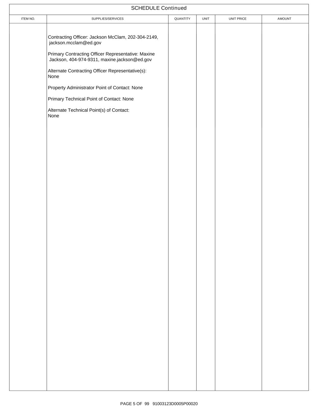 SCHEDULE Continued ITEM NO. SUPPLIES/SERVICES QUANTITY UNIT UNIT PRICE AMOUNT Contracting Officer: Jackson McClam, 202-304-2149, jackson.mcclam@ed.gov Primary Contracting Officer Representative: Maxine Jackson, 404-974-9311, maxine.jackson@ed.gov Alternate Contracting Officer Representative(s): None Property Administrator Point of Contact: None Primary Technical Point of Contact: None Alternate Technical Point(s) of Contact: None PAGE 5 OF 99 91003123D0005P00020