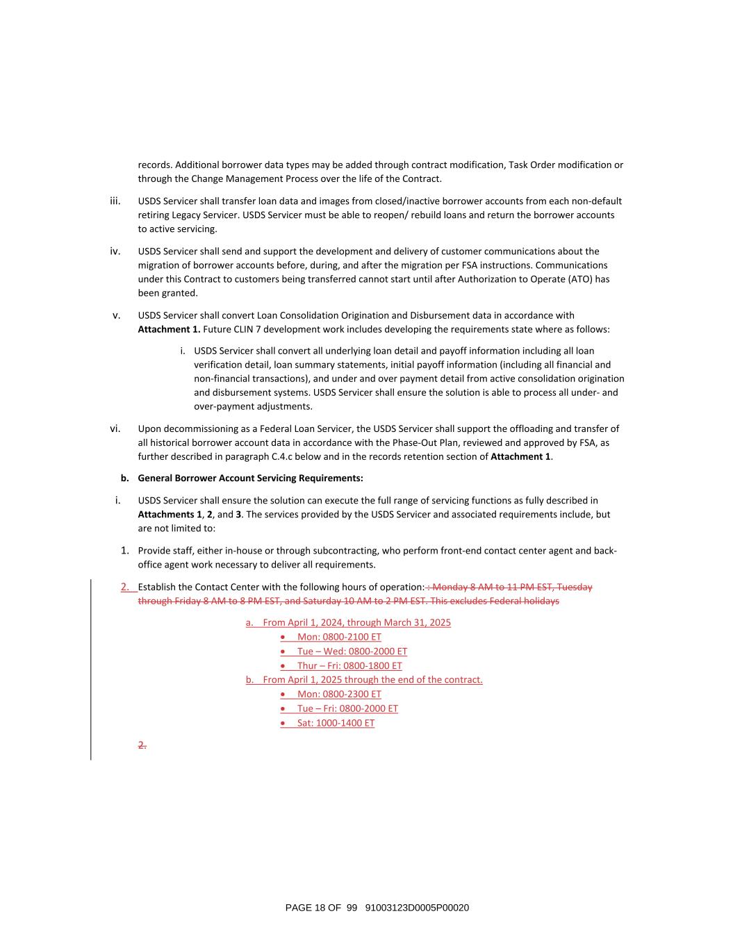 PAGE 18 OF 99 91003123D0005P00020 records. Additional borrower data types may be added through contract modification, Task Order modification or through the Change Management Process over the life of the Contract. iii. USDS Servicer shall transfer loan data and images from closed/inactive borrower accounts from each non-default retiring Legacy Servicer. USDS Servicer must be able to reopen/ rebuild loans and return the borrower accounts to active servicing. iv. USDS Servicer shall send and support the development and delivery of customer communications about the migration of borrower accounts before, during, and after the migration per FSA instructions. Communications under this Contract to customers being transferred cannot start until after Authorization to Operate (ATO) has been granted. v. USDS Servicer shall convert Loan Consolidation Origination and Disbursement data in accordance with Attachment 1. Future CLIN 7 development work includes developing the requirements state where as follows: i. USDS Servicer shall convert all underlying loan detail and payoff information including all loan verification detail, loan summary statements, initial payoff information (including all financial and non-financial transactions), and under and over payment detail from active consolidation origination and disbursement systems. USDS Servicer shall ensure the solution is able to process all under- and over-payment adjustments. vi. Upon decommissioning as a Federal Loan Servicer, the USDS Servicer shall support the offloading and transfer of all historical borrower account data in accordance with the Phase-Out Plan, reviewed and approved by FSA, as further described in paragraph C.4.c below and in the records retention section of Attachment 1. b. General Borrower Account Servicing Requirements: i. USDS Servicer shall ensure the solution can execute the full range of servicing functions as fully described in Attachments 1, 2, and 3. The services provided by the USDS Servicer and associated requirements include, but are not limited to: 1. Provide staff, either in-house or through subcontracting, who perform front-end contact center agent and back- office agent work necessary to deliver all requirements. 2. Establish the Contact Center with the following hours of operation: : Monday 8 AM to 11 PM EST, Tuesday through Friday 8 AM to 8 PM EST, and Saturday 10 AM to 2 PM EST. This excludes Federal holidays a. From April 1, 2024, through March 31, 2025 • Mon: 0800-2100 ET • Tue – Wed: 0800-2000 ET • Thur – Fri: 0800-1800 ET b. From April 1, 2025 through the end of the contract. • Mon: 0800-2300 ET • Tue – Fri: 0800-2000 ET • Sat: 1000-1400 ET 2.