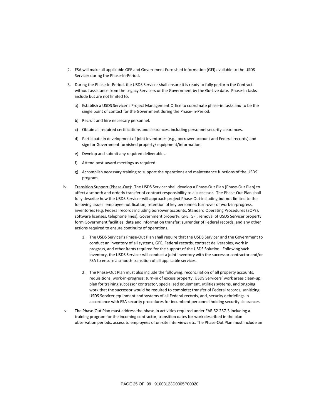 PAGE 25 OF 99 91003123D0005P00020 2. FSA will make all applicable GFE and Government Furnished Information (GFI) available to the USDS Servicer during the Phase-In-Period. 3. During the Phase-In-Period, the USDS Servicer shall ensure it is ready to fully perform the Contract without assistance from the Legacy Servicers or the Government by the Go-Live date. Phase-In tasks include but are not limited to: a) Establish a USDS Servicer’s Project Management Office to coordinate phase-in tasks and to be the single point of contact for the Government during the Phase-In-Period. b) Recruit and hire necessary personnel. c) Obtain all required certifications and clearances, including personnel security clearances. d) Participate in development of joint inventories (e.g., borrower account and Federal records) and sign for Government furnished property/ equipment/information. e) Develop and submit any required deliverables. f) Attend post-award meetings as required. g) Accomplish necessary training to support the operations and maintenance functions of the USDS program. iv. Transition Support (Phase-Out): The USDS Servicer shall develop a Phase-Out Plan (Phase-Out Plan) to affect a smooth and orderly transfer of contract responsibility to a successor. The Phase-Out Plan shall fully describe how the USDS Servicer will approach project Phase-Out including but not limited to the following issues: employee notification; retention of key personnel; turn-over of work-in-progress, inventories (e.g. Federal records including borrower accounts, Standard Operating Procedures (SOPs), software licenses, telephone lines), Government property; GFE, GFI, removal of USDS Servicer property form Government facilities; data and information transfer; surrender of Federal records, and any other actions required to ensure continuity of operations. 1. The USDS Servicer’s Phase-Out Plan shall require that the USDS Servicer and the Government to conduct an inventory of all systems, GFE, Federal records, contract deliverables, work in progress, and other items required for the support of the USDS Solution. Following such inventory, the USDS Servicer will conduct a joint inventory with the successor contractor and/or FSA to ensure a smooth transition of all applicable services. 2. The Phase-Out Plan must also include the following: reconciliation of all property accounts, requisitions, work-in-progress; turn-in of excess property; USDS Servicers’ work areas clean-up; plan for training successor contractor, specialized equipment, utilities systems, and ongoing work that the successor would be required to complete; transfer of Federal records, sanitizing USDS Servicer equipment and systems of all Federal records, and, security debriefings in accordance with FSA security procedures for incumbent personnel holding security clearances. v. The Phase-Out Plan must address the phase-in activities required under FAR 52.237-3 including a training program for the incoming contractor, transition dates for work described in the plan observation periods, access to employees of on-site interviews etc. The Phase-Out Plan must include an