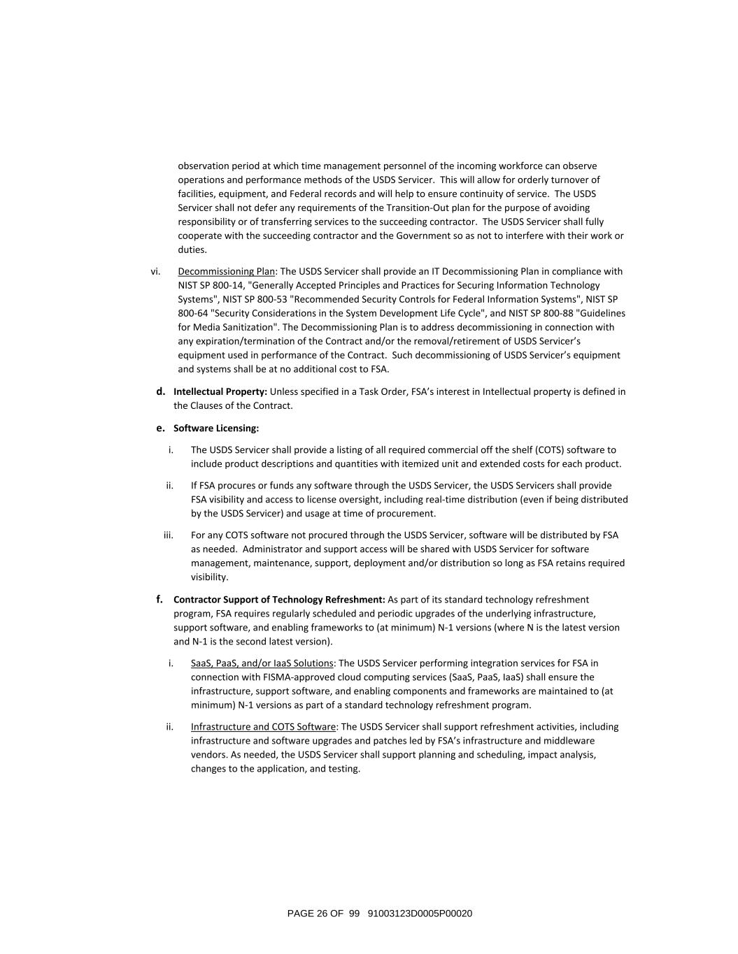 PAGE 26 OF 99 91003123D0005P00020 observation period at which time management personnel of the incoming workforce can observe operations and performance methods of the USDS Servicer. This will allow for orderly turnover of facilities, equipment, and Federal records and will help to ensure continuity of service. The USDS Servicer shall not defer any requirements of the Transition-Out plan for the purpose of avoiding responsibility or of transferring services to the succeeding contractor. The USDS Servicer shall fully cooperate with the succeeding contractor and the Government so as not to interfere with their work or duties. vi. Decommissioning Plan: The USDS Servicer shall provide an IT Decommissioning Plan in compliance with NIST SP 800-14, "Generally Accepted Principles and Practices for Securing Information Technology Systems", NIST SP 800-53 "Recommended Security Controls for Federal Information Systems", NIST SP 800-64 "Security Considerations in the System Development Life Cycle", and NIST SP 800-88 "Guidelines for Media Sanitization". The Decommissioning Plan is to address decommissioning in connection with any expiration/termination of the Contract and/or the removal/retirement of USDS Servicer’s equipment used in performance of the Contract. Such decommissioning of USDS Servicer’s equipment and systems shall be at no additional cost to FSA. d. Intellectual Property: Unless specified in a Task Order, FSA’s interest in Intellectual property is defined in the Clauses of the Contract. e. Software Licensing: i. The USDS Servicer shall provide a listing of all required commercial off the shelf (COTS) software to include product descriptions and quantities with itemized unit and extended costs for each product. ii. If FSA procures or funds any software through the USDS Servicer, the USDS Servicers shall provide FSA visibility and access to license oversight, including real-time distribution (even if being distributed by the USDS Servicer) and usage at time of procurement. iii. For any COTS software not procured through the USDS Servicer, software will be distributed by FSA as needed. Administrator and support access will be shared with USDS Servicer for software management, maintenance, support, deployment and/or distribution so long as FSA retains required visibility. f. Contractor Support of Technology Refreshment: As part of its standard technology refreshment program, FSA requires regularly scheduled and periodic upgrades of the underlying infrastructure, support software, and enabling frameworks to (at minimum) N-1 versions (where N is the latest version and N-1 is the second latest version). i. SaaS, PaaS, and/or IaaS Solutions: The USDS Servicer performing integration services for FSA in connection with FISMA-approved cloud computing services (SaaS, PaaS, IaaS) shall ensure the infrastructure, support software, and enabling components and frameworks are maintained to (at minimum) N-1 versions as part of a standard technology refreshment program. ii. Infrastructure and COTS Software: The USDS Servicer shall support refreshment activities, including infrastructure and software upgrades and patches led by FSA’s infrastructure and middleware vendors. As needed, the USDS Servicer shall support planning and scheduling, impact analysis, changes to the application, and testing.