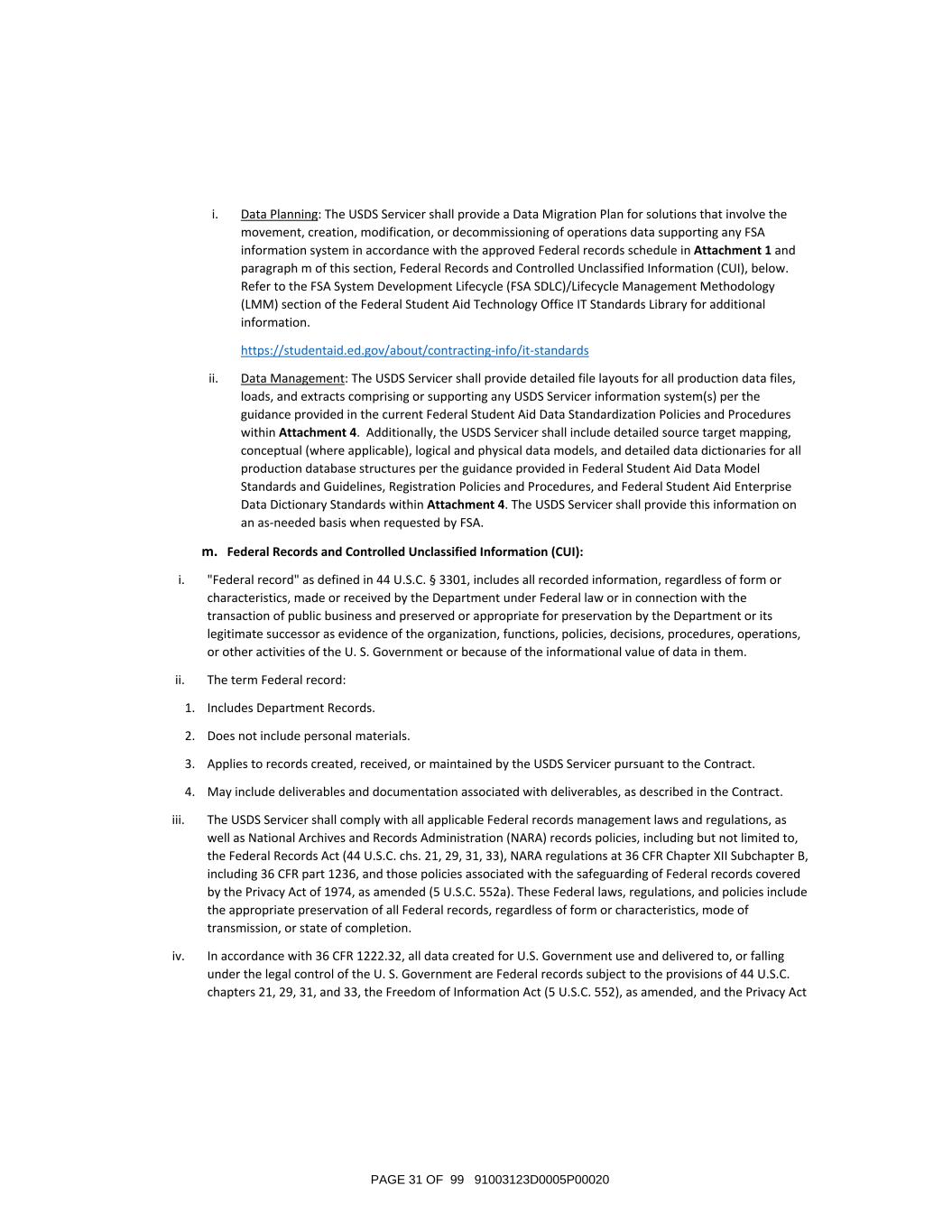 PAGE 31 OF 99 91003123D0005P00020 i. Data Planning: The USDS Servicer shall provide a Data Migration Plan for solutions that involve the movement, creation, modification, or decommissioning of operations data supporting any FSA information system in accordance with the approved Federal records schedule in Attachment 1 and paragraph m of this section, Federal Records and Controlled Unclassified Information (CUI), below. Refer to the FSA System Development Lifecycle (FSA SDLC)/Lifecycle Management Methodology (LMM) section of the Federal Student Aid Technology Office IT Standards Library for additional information. https://studentaid.ed.gov/about/contracting-info/it-standards ii. Data Management: The USDS Servicer shall provide detailed file layouts for all production data files, loads, and extracts comprising or supporting any USDS Servicer information system(s) per the guidance provided in the current Federal Student Aid Data Standardization Policies and Procedures within Attachment 4. Additionally, the USDS Servicer shall include detailed source target mapping, conceptual (where applicable), logical and physical data models, and detailed data dictionaries for all production database structures per the guidance provided in Federal Student Aid Data Model Standards and Guidelines, Registration Policies and Procedures, and Federal Student Aid Enterprise Data Dictionary Standards within Attachment 4. The USDS Servicer shall provide this information on an as-needed basis when requested by FSA. m. Federal Records and Controlled Unclassified Information (CUI): i. "Federal record" as defined in 44 U.S.C. § 3301, includes all recorded information, regardless of form or characteristics, made or received by the Department under Federal law or in connection with the transaction of public business and preserved or appropriate for preservation by the Department or its legitimate successor as evidence of the organization, functions, policies, decisions, procedures, operations, or other activities of the U. S. Government or because of the informational value of data in them. ii. The term Federal record: 1. Includes Department Records. 2. Does not include personal materials. 3. Applies to records created, received, or maintained by the USDS Servicer pursuant to the Contract. 4. May include deliverables and documentation associated with deliverables, as described in the Contract. iii. The USDS Servicer shall comply with all applicable Federal records management laws and regulations, as well as National Archives and Records Administration (NARA) records policies, including but not limited to, the Federal Records Act (44 U.S.C. chs. 21, 29, 31, 33), NARA regulations at 36 CFR Chapter XII Subchapter B, including 36 CFR part 1236, and those policies associated with the safeguarding of Federal records covered by the Privacy Act of 1974, as amended (5 U.S.C. 552a). These Federal laws, regulations, and policies include the appropriate preservation of all Federal records, regardless of form or characteristics, mode of transmission, or state of completion. iv. In accordance with 36 CFR 1222.32, all data created for U.S. Government use and delivered to, or falling under the legal control of the U. S. Government are Federal records subject to the provisions of 44 U.S.C. chapters 21, 29, 31, and 33, the Freedom of Information Act (5 U.S.C. 552), as amended, and the Privacy Act