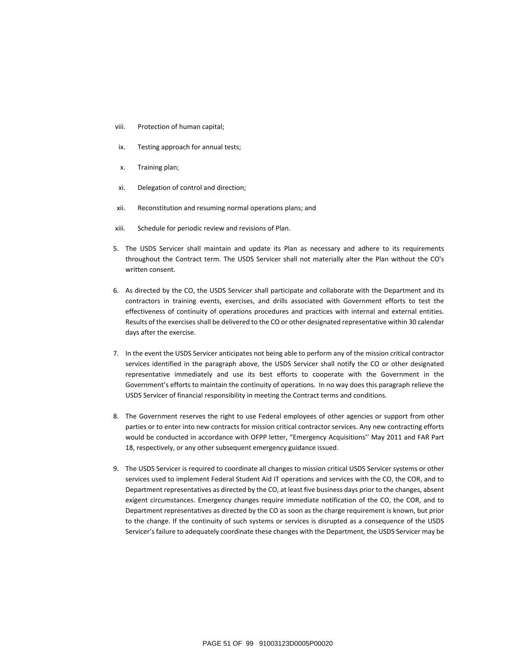 PAGE 51 OF 99 91003123D0005P00020 viii. Protection of human capital; ix. Testing approach for annual tests; x. Training plan; xi. Delegation of control and direction; xii. Reconstitution and resuming normal operations plans; and xiii. Schedule for periodic review and revisions of Plan. 5. The USDS Servicer shall maintain and update its Plan as necessary and adhere to its requirements throughout the Contract term. The USDS Servicer shall not materially alter the Plan without the CO's written consent. 6. As directed by the CO, the USDS Servicer shall participate and collaborate with the Department and its contractors in training events, exercises, and drills associated with Government efforts to test the effectiveness of continuity of operations procedures and practices with internal and external entities. Results of the exercises shall be delivered to the CO or other designated representative within 30 calendar days after the exercise. 7. In the event the USDS Servicer anticipates not being able to perform any of the mission critical contractor services identified in the paragraph above, the USDS Servicer shall notify the CO or other designated representative immediately and use its best efforts to cooperate with the Government in the Government’s efforts to maintain the continuity of operations. In no way does this paragraph relieve the USDS Servicer of financial responsibility in meeting the Contract terms and conditions. 8. The Government reserves the right to use Federal employees of other agencies or support from other parties or to enter into new contracts for mission critical contractor services. Any new contracting efforts would be conducted in accordance with OFPP letter, “Emergency Acquisitions’’ May 2011 and FAR Part 18, respectively, or any other subsequent emergency guidance issued. 9. The USDS Servicer is required to coordinate all changes to mission critical USDS Servicer systems or other services used to implement Federal Student Aid IT operations and services with the CO, the COR, and to Department representatives as directed by the CO, at least five business days prior to the changes, absent exigent circumstances. Emergency changes require immediate notification of the CO, the COR, and to Department representatives as directed by the CO as soon as the charge requirement is known, but prior to the change. If the continuity of such systems or services is disrupted as a consequence of the USDS Servicer’s failure to adequately coordinate these changes with the Department, the USDS Servicer may be