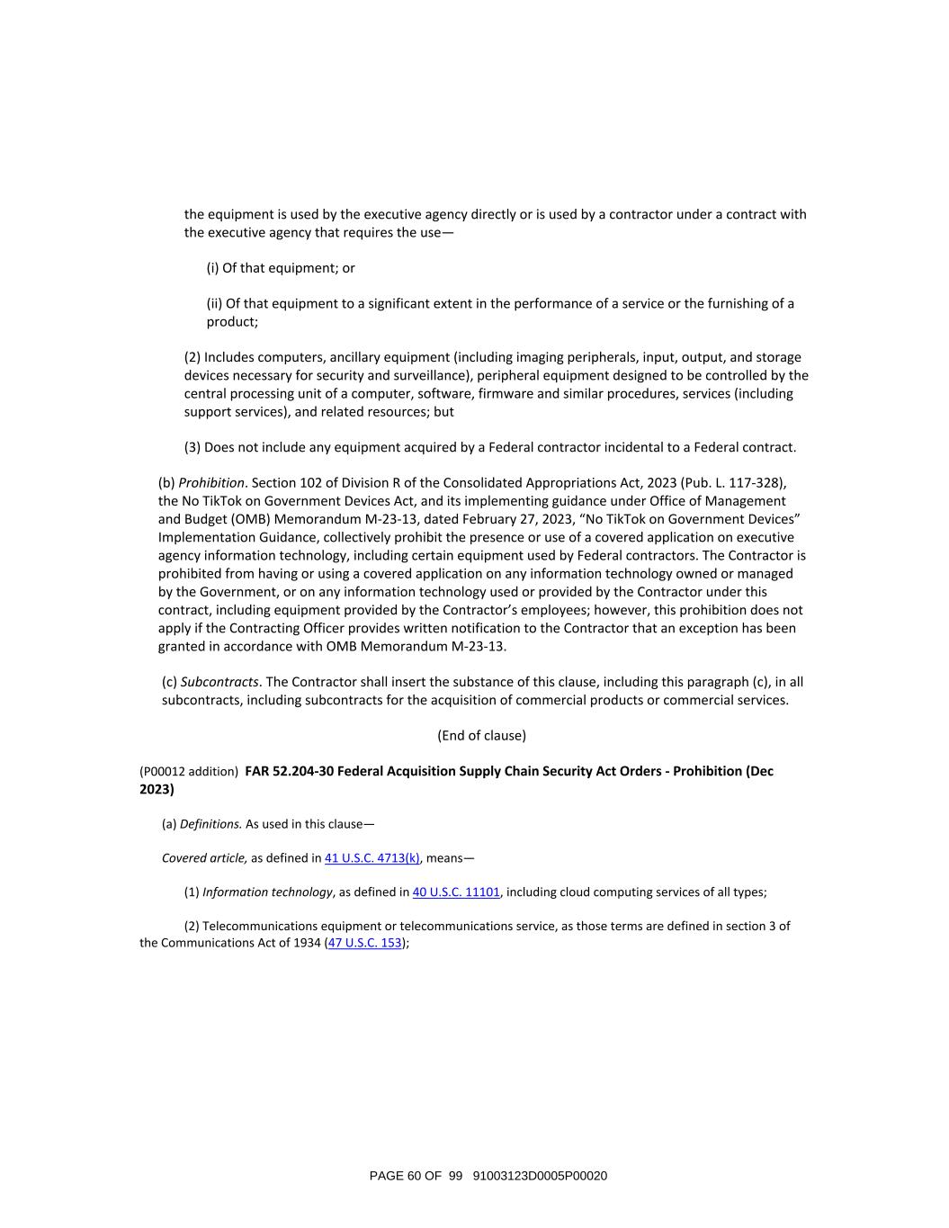 PAGE 60 OF 99 91003123D0005P00020 the equipment is used by the executive agency directly or is used by a contractor under a contract with the executive agency that requires the use— (i) Of that equipment; or (ii) Of that equipment to a significant extent in the performance of a service or the furnishing of a product; (2) Includes computers, ancillary equipment (including imaging peripherals, input, output, and storage devices necessary for security and surveillance), peripheral equipment designed to be controlled by the central processing unit of a computer, software, firmware and similar procedures, services (including support services), and related resources; but (3) Does not include any equipment acquired by a Federal contractor incidental to a Federal contract. (b) Prohibition. Section 102 of Division R of the Consolidated Appropriations Act, 2023 (Pub. L. 117-328), the No TikTok on Government Devices Act, and its implementing guidance under Office of Management and Budget (OMB) Memorandum M-23-13, dated February 27, 2023, “No TikTok on Government Devices” Implementation Guidance, collectively prohibit the presence or use of a covered application on executive agency information technology, including certain equipment used by Federal contractors. The Contractor is prohibited from having or using a covered application on any information technology owned or managed by the Government, or on any information technology used or provided by the Contractor under this contract, including equipment provided by the Contractor’s employees; however, this prohibition does not apply if the Contracting Officer provides written notification to the Contractor that an exception has been granted in accordance with OMB Memorandum M-23-13. (c) Subcontracts. The Contractor shall insert the substance of this clause, including this paragraph (c), in all subcontracts, including subcontracts for the acquisition of commercial products or commercial services. (End of clause) (P00012 addition) FAR 52.204-30 Federal Acquisition Supply Chain Security Act Orders - Prohibition (Dec 2023) (a) Definitions. As used in this clause— Covered article, as defined in 41 U.S.C. 4713(k), means— (1) Information technology, as defined in 40 U.S.C. 11101, including cloud computing services of all types; (2) Telecommunications equipment or telecommunications service, as those terms are defined in section 3 of the Communications Act of 1934 (47 U.S.C. 153);