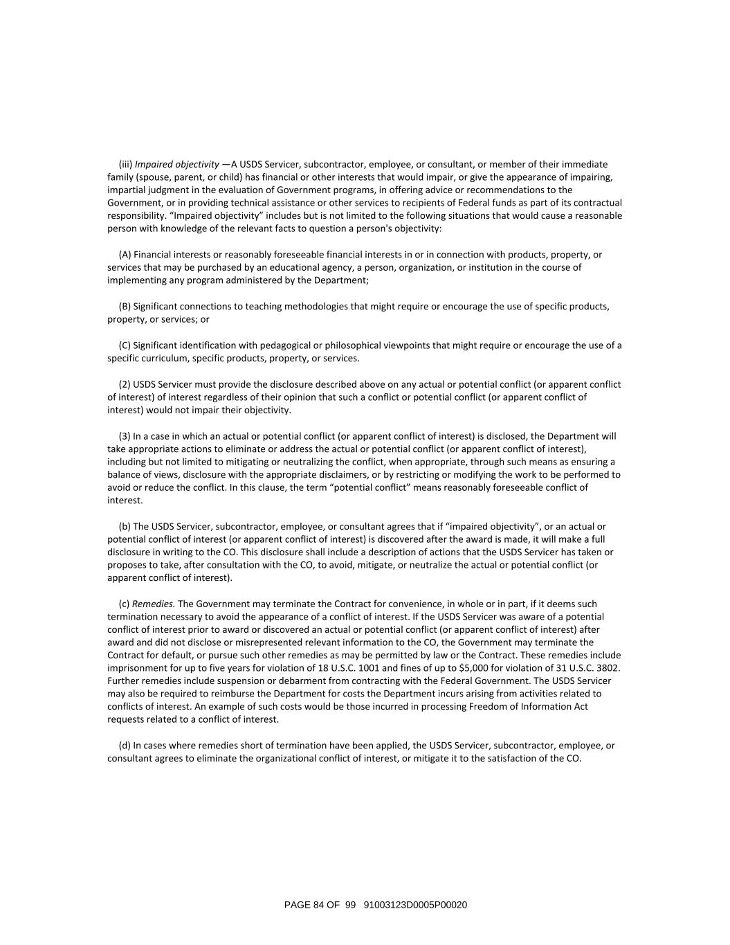 PAGE 84 OF 99 91003123D0005P00020 (iii) Impaired objectivity —A USDS Servicer, subcontractor, employee, or consultant, or member of their immediate family (spouse, parent, or child) has financial or other interests that would impair, or give the appearance of impairing, impartial judgment in the evaluation of Government programs, in offering advice or recommendations to the Government, or in providing technical assistance or other services to recipients of Federal funds as part of its contractual responsibility. “Impaired objectivity” includes but is not limited to the following situations that would cause a reasonable person with knowledge of the relevant facts to question a person's objectivity: (A) Financial interests or reasonably foreseeable financial interests in or in connection with products, property, or services that may be purchased by an educational agency, a person, organization, or institution in the course of implementing any program administered by the Department; (B) Significant connections to teaching methodologies that might require or encourage the use of specific products, property, or services; or (C) Significant identification with pedagogical or philosophical viewpoints that might require or encourage the use of a specific curriculum, specific products, property, or services. (2) USDS Servicer must provide the disclosure described above on any actual or potential conflict (or apparent conflict of interest) of interest regardless of their opinion that such a conflict or potential conflict (or apparent conflict of interest) would not impair their objectivity. (3) In a case in which an actual or potential conflict (or apparent conflict of interest) is disclosed, the Department will take appropriate actions to eliminate or address the actual or potential conflict (or apparent conflict of interest), including but not limited to mitigating or neutralizing the conflict, when appropriate, through such means as ensuring a balance of views, disclosure with the appropriate disclaimers, or by restricting or modifying the work to be performed to avoid or reduce the conflict. In this clause, the term “potential conflict” means reasonably foreseeable conflict of interest. (b) The USDS Servicer, subcontractor, employee, or consultant agrees that if “impaired objectivity”, or an actual or potential conflict of interest (or apparent conflict of interest) is discovered after the award is made, it will make a full disclosure in writing to the CO. This disclosure shall include a description of actions that the USDS Servicer has taken or proposes to take, after consultation with the CO, to avoid, mitigate, or neutralize the actual or potential conflict (or apparent conflict of interest). (c) Remedies. The Government may terminate the Contract for convenience, in whole or in part, if it deems such termination necessary to avoid the appearance of a conflict of interest. If the USDS Servicer was aware of a potential conflict of interest prior to award or discovered an actual or potential conflict (or apparent conflict of interest) after award and did not disclose or misrepresented relevant information to the CO, the Government may terminate the Contract for default, or pursue such other remedies as may be permitted by law or the Contract. These remedies include imprisonment for up to five years for violation of 18 U.S.C. 1001 and fines of up to $5,000 for violation of 31 U.S.C. 3802. Further remedies include suspension or debarment from contracting with the Federal Government. The USDS Servicer may also be required to reimburse the Department for costs the Department incurs arising from activities related to conflicts of interest. An example of such costs would be those incurred in processing Freedom of Information Act requests related to a conflict of interest. (d) In cases where remedies short of termination have been applied, the USDS Servicer, subcontractor, employee, or consultant agrees to eliminate the organizational conflict of interest, or mitigate it to the satisfaction of the CO.