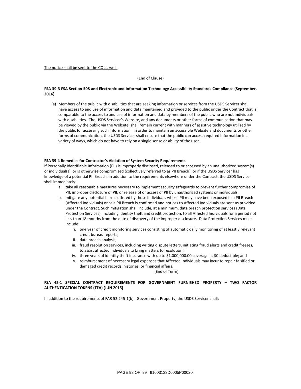 PAGE 93 OF 99 91003123D0005P00020 The notice shall be sent to the CO as well. (End of Clause) FSA 39-3 FSA Section 508 and Electronic and Information Technology Accessibility Standards Compliance (September, 2016) (a) Members of the public with disabilities that are seeking information or services from the USDS Servicer shall have access to and use of information and data maintained and provided to the public under the Contract that is comparable to the access to and use of information and data by members of the public who are not individuals with disabilities. The USDS Servicer’s Website, and any documents or other forms of communication that may be viewed by the public via the Website, shall remain current with manners of assistive technology utilized by the public for accessing such information. In order to maintain an accessible Website and documents or other forms of communication, the USDS Servicer shall ensure that the public can access required information in a variety of ways, which do not have to rely on a single sense or ability of the user. FSA 39-4 Remedies for Contractor’s Violation of System Security Requirements If Personally Identifiable Information (PII) is improperly disclosed, released to or accessed by an unauthorized system(s) or individual(s), or is otherwise compromised (collectively referred to as PII Breach), or if the USDS Servicer has knowledge of a potential PII Breach, in addition to the requirements elsewhere under the Contract, the USDS Servicer shall immediately: a. take all reasonable measures necessary to implement security safeguards to prevent further compromise of PII, improper disclosure of PII, or release of or access of PII by unauthorized systems or individuals. b. mitigate any potential harm suffered by those individuals whose PII may have been exposed in a PII Breach (Affected Individuals) once a PII Breach is confirmed and notices to Affected Individuals are sent as provided under the Contract. Such mitigation shall include, at a minimum, data breach protection services (Data Protection Services), including identity theft and credit protection, to all Affected Individuals for a period not less than 18 months from the date of discovery of the improper disclosure. Data Protection Services must include: i. one year of credit monitoring services consisting of automatic daily monitoring of at least 3 relevant credit bureau reports; ii. data breach analysis; iii. fraud resolution services, including writing dispute letters, initiating fraud alerts and credit freezes, to assist affected individuals to bring matters to resolution; iv. three years of identity theft insurance with up to $1,000,000.00 coverage at $0 deductible; and v. reimbursement of necessary legal expenses that Affected Individuals may incur to repair falsified or damaged credit records, histories, or financial affairs. (End of Term) FSA 45-1 SPECIAL CONTRACT REQUIREMENTS FOR GOVERNMENT FURNISHED PROPERTY – TWO FACTOR AUTHENTICATION TOKENS (TFA) (JUN 2015) In addition to the requirements of FAR 52.245-1(b) - Government Property, the USDS Servicer shall: