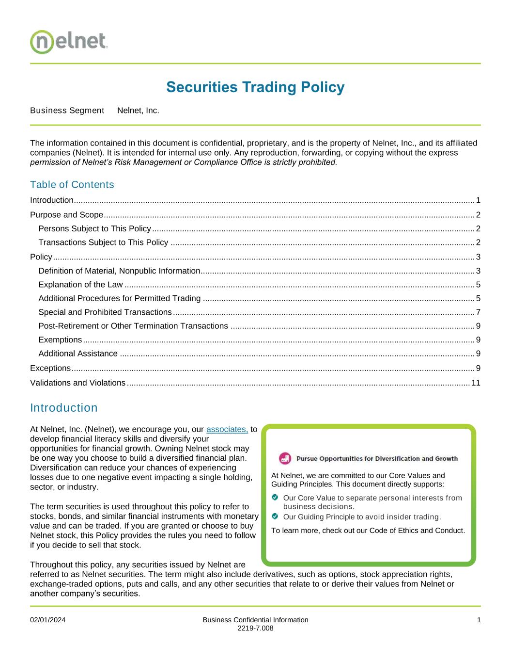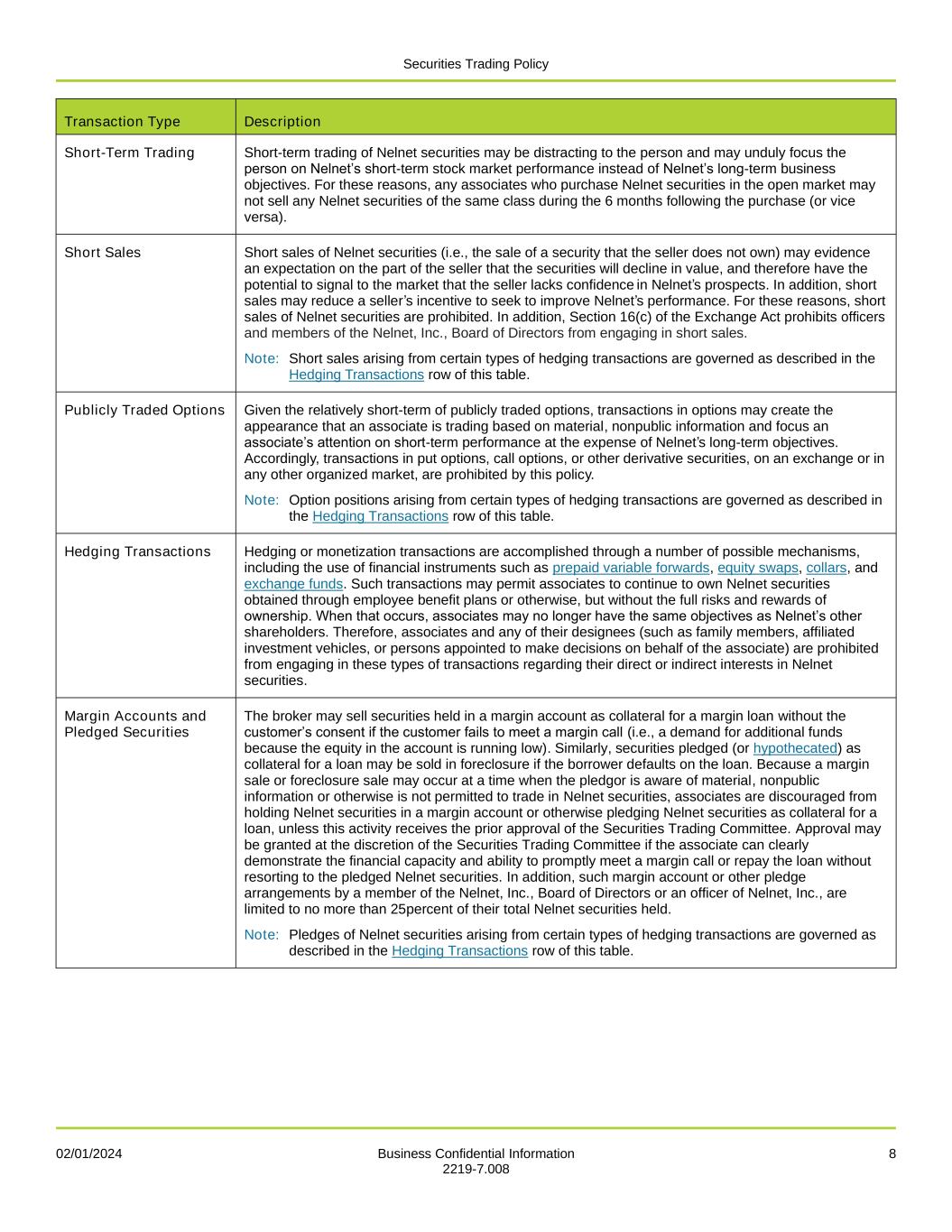 02/01/2024 Business Confidential Information 1 2219-7.008 Securities Trading Policy Business Segment Nelnet, Inc. The information contained in this document is confidential, proprietary, and is the property of Nelnet, Inc., and its affiliated companies (Nelnet). It is intended for internal use only. Any reproduction, forwarding, or copying without the express permission of Nelnet’s Risk Management or Compliance Office is strictly prohibited. Table of Contents Introduction .............................................................................................................................................................................. 1 Purpose and Scope ................................................................................................................................................................. 2 Persons Subject to This Policy ............................................................................................................................................ 2 Transactions Subject to This Policy .................................................................................................................................... 2 Policy ....................................................................................................................................................................................... 3 Definition of Material, Nonpublic Information ....................................................................................................................... 3 Explanation of the Law ........................................................................................................................................................ 5 Additional Procedures for Permitted Trading ...................................................................................................................... 5 Special and Prohibited Transactions ................................................................................................................................... 7 Post-Retirement or Other Termination Transactions .......................................................................................................... 9 Exemptions .......................................................................................................................................................................... 9 Additional Assistance .......................................................................................................................................................... 9 Exceptions ............................................................................................................................................................................... 9 Validations and Violations ..................................................................................................................................................... 11 Introduction At Nelnet, Inc. (Nelnet), we encourage you, our associates, to develop financial literacy skills and diversify your opportunities for financial growth. Owning Nelnet stock may be one way you choose to build a diversified financial plan. Diversification can reduce your chances of experiencing losses due to one negative event impacting a single holding, sector, or industry. The term securities is used throughout this policy to refer to stocks, bonds, and similar financial instruments with monetary value and can be traded. If you are granted or choose to buy Nelnet stock, this Policy provides the rules you need to follow if you decide to sell that stock. Throughout this policy, any securities issued by Nelnet are referred to as Nelnet securities. The term might also include derivatives, such as options, stock appreciation rights, exchange-traded options, puts and calls, and any other securities that relate to or derive their values from Nelnet or another company’s securities. At Nelnet, we are committed to our Core Values and Guiding Principles. This document directly supports: Our Core Value to separate personal interests from business decisions. Our Guiding Principle to avoid insider trading. To learn more, check out our Code of Ethics and Conduct.
