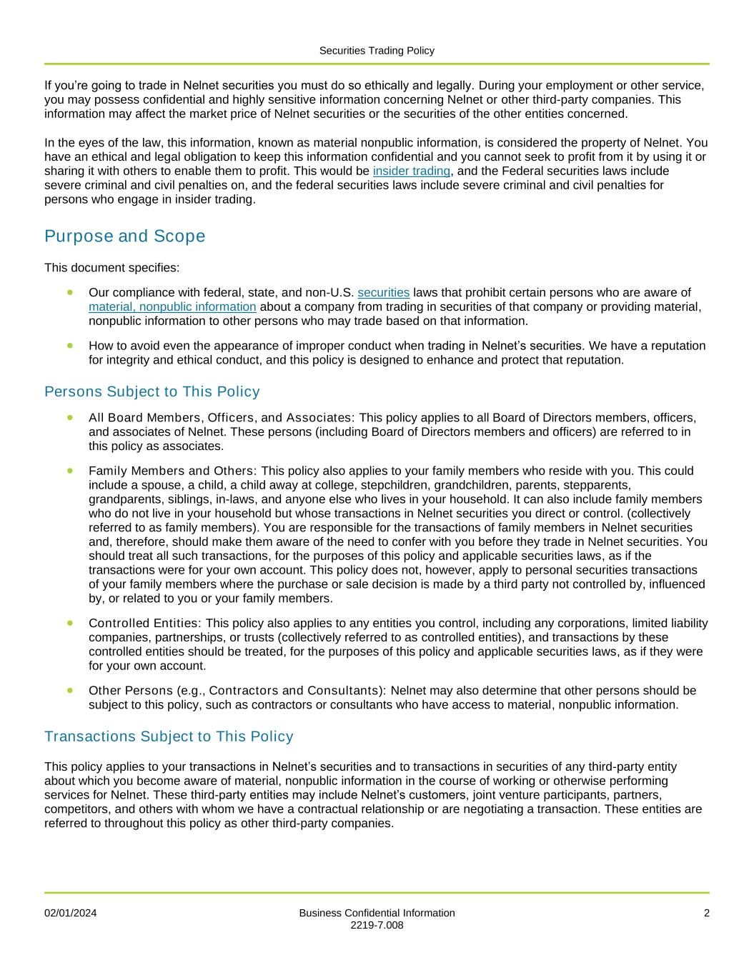 Securities Trading Policy 02/01/2024 Business Confidential Information 2 2219-7.008 If you’re going to trade in Nelnet securities you must do so ethically and legally. During your employment or other service, you may possess confidential and highly sensitive information concerning Nelnet or other third-party companies. This information may affect the market price of Nelnet securities or the securities of the other entities concerned. In the eyes of the law, this information, known as material nonpublic information, is considered the property of Nelnet. You have an ethical and legal obligation to keep this information confidential and you cannot seek to profit from it by using it or sharing it with others to enable them to profit. This would be insider trading, and the Federal securities laws include severe criminal and civil penalties on, and the federal securities laws include severe criminal and civil penalties for persons who engage in insider trading. Purpose and Scope This document specifies: • Our compliance with federal, state, and non-U.S. securities laws that prohibit certain persons who are aware of material, nonpublic information about a company from trading in securities of that company or providing material, nonpublic information to other persons who may trade based on that information. • How to avoid even the appearance of improper conduct when trading in Nelnet’s securities. We have a reputation for integrity and ethical conduct, and this policy is designed to enhance and protect that reputation. Persons Subject to This Policy • All Board Members, Officers, and Associates: This policy applies to all Board of Directors members, officers, and associates of Nelnet. These persons (including Board of Directors members and officers) are referred to in this policy as associates. • Family Members and Others: This policy also applies to your family members who reside with you. This could include a spouse, a child, a child away at college, stepchildren, grandchildren, parents, stepparents, grandparents, siblings, in-laws, and anyone else who lives in your household. It can also include family members who do not live in your household but whose transactions in Nelnet securities you direct or control. (collectively referred to as family members). You are responsible for the transactions of family members in Nelnet securities and, therefore, should make them aware of the need to confer with you before they trade in Nelnet securities. You should treat all such transactions, for the purposes of this policy and applicable securities laws, as if the transactions were for your own account. This policy does not, however, apply to personal securities transactions of your family members where the purchase or sale decision is made by a third party not controlled by, influenced by, or related to you or your family members. • Controlled Entities: This policy also applies to any entities you control, including any corporations, limited liability companies, partnerships, or trusts (collectively referred to as controlled entities), and transactions by these controlled entities should be treated, for the purposes of this policy and applicable securities laws, as if they were for your own account. • Other Persons (e.g., Contractors and Consultants): Nelnet may also determine that other persons should be subject to this policy, such as contractors or consultants who have access to material, nonpublic information. Transactions Subject to This Policy This policy applies to your transactions in Nelnet’s securities and to transactions in securities of any third-party entity about which you become aware of material, nonpublic information in the course of working or otherwise performing services for Nelnet. These third-party entities may include Nelnet’s customers, joint venture participants, partners, competitors, and others with whom we have a contractual relationship or are negotiating a transaction. These entities are referred to throughout this policy as other third-party companies.