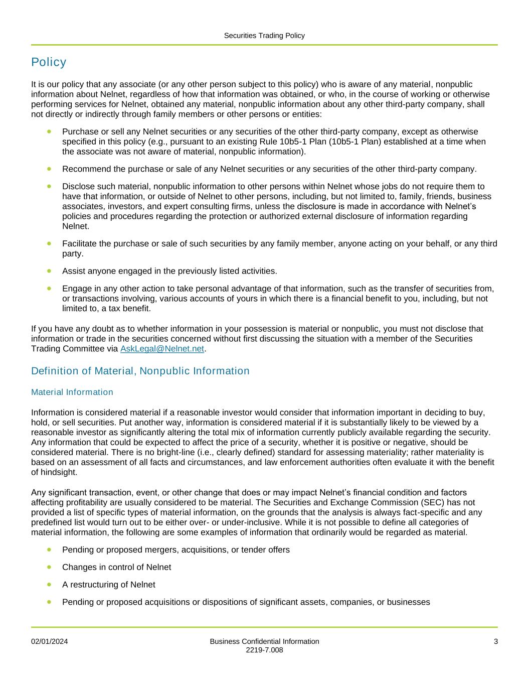 Securities Trading Policy 02/01/2024 Business Confidential Information 3 2219-7.008 Policy It is our policy that any associate (or any other person subject to this policy) who is aware of any material, nonpublic information about Nelnet, regardless of how that information was obtained, or who, in the course of working or otherwise performing services for Nelnet, obtained any material, nonpublic information about any other third-party company, shall not directly or indirectly through family members or other persons or entities: • Purchase or sell any Nelnet securities or any securities of the other third-party company, except as otherwise specified in this policy (e.g., pursuant to an existing Rule 10b5-1 Plan (10b5-1 Plan) established at a time when the associate was not aware of material, nonpublic information). • Recommend the purchase or sale of any Nelnet securities or any securities of the other third-party company. • Disclose such material, nonpublic information to other persons within Nelnet whose jobs do not require them to have that information, or outside of Nelnet to other persons, including, but not limited to, family, friends, business associates, investors, and expert consulting firms, unless the disclosure is made in accordance with Nelnet’s policies and procedures regarding the protection or authorized external disclosure of information regarding Nelnet. • Facilitate the purchase or sale of such securities by any family member, anyone acting on your behalf, or any third party. • Assist anyone engaged in the previously listed activities. • Engage in any other action to take personal advantage of that information, such as the transfer of securities from, or transactions involving, various accounts of yours in which there is a financial benefit to you, including, but not limited to, a tax benefit. If you have any doubt as to whether information in your possession is material or nonpublic, you must not disclose that information or trade in the securities concerned without first discussing the situation with a member of the Securities Trading Committee via AskLegal@Nelnet.net. Definition of Material, Nonpublic Information Material Information Information is considered material if a reasonable investor would consider that information important in deciding to buy, hold, or sell securities. Put another way, information is considered material if it is substantially likely to be viewed by a reasonable investor as significantly altering the total mix of information currently publicly available regarding the security. Any information that could be expected to affect the price of a security, whether it is positive or negative, should be considered material. There is no bright-line (i.e., clearly defined) standard for assessing materiality; rather materiality is based on an assessment of all facts and circumstances, and law enforcement authorities often evaluate it with the benefit of hindsight. Any significant transaction, event, or other change that does or may impact Nelnet’s financial condition and factors affecting profitability are usually considered to be material. The Securities and Exchange Commission (SEC) has not provided a list of specific types of material information, on the grounds that the analysis is always fact-specific and any predefined list would turn out to be either over- or under-inclusive. While it is not possible to define all categories of material information, the following are some examples of information that ordinarily would be regarded as material. • Pending or proposed mergers, acquisitions, or tender offers • Changes in control of Nelnet • A restructuring of Nelnet • Pending or proposed acquisitions or dispositions of significant assets, companies, or businesses