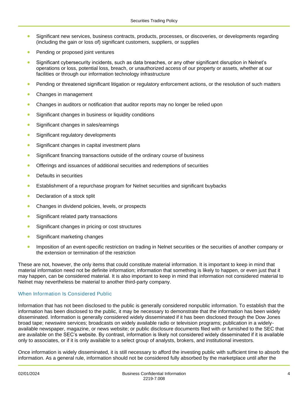 Securities Trading Policy 02/01/2024 Business Confidential Information 4 2219-7.008 • Significant new services, business contracts, products, processes, or discoveries, or developments regarding (including the gain or loss of) significant customers, suppliers, or supplies • Pending or proposed joint ventures • Significant cybersecurity incidents, such as data breaches, or any other significant disruption in Nelnet’s operations or loss, potential loss, breach, or unauthorized access of our property or assets, whether at our facilities or through our information technology infrastructure • Pending or threatened significant litigation or regulatory enforcement actions, or the resolution of such matters • Changes in management • Changes in auditors or notification that auditor reports may no longer be relied upon • Significant changes in business or liquidity conditions • Significant changes in sales/earnings • Significant regulatory developments • Significant changes in capital investment plans • Significant financing transactions outside of the ordinary course of business • Offerings and issuances of additional securities and redemptions of securities • Defaults in securities • Establishment of a repurchase program for Nelnet securities and significant buybacks • Declaration of a stock split • Changes in dividend policies, levels, or prospects • Significant related party transactions • Significant changes in pricing or cost structures • Significant marketing changes • Imposition of an event-specific restriction on trading in Nelnet securities or the securities of another company or the extension or termination of the restriction These are not, however, the only items that could constitute material information. It is important to keep in mind that material information need not be definite information; information that something is likely to happen, or even just that it may happen, can be considered material. It is also important to keep in mind that information not considered material to Nelnet may nevertheless be material to another third-party company. When Information Is Considered Public Information that has not been disclosed to the public is generally considered nonpublic information. To establish that the information has been disclosed to the public, it may be necessary to demonstrate that the information has been widely disseminated. Information is generally considered widely disseminated if it has been disclosed through the Dow Jones broad tape; newswire services; broadcasts on widely available radio or television programs; publication in a widely- available newspaper, magazine, or news website; or public disclosure documents filed with or furnished to the SEC that are available on the SEC’s website. By contrast, information is likely not considered widely disseminated if it is available only to associates, or if it is only available to a select group of analysts, brokers, and institutional investors. Once information is widely disseminated, it is still necessary to afford the investing public with sufficient time to absorb the information. As a general rule, information should not be considered fully absorbed by the marketplace until after the