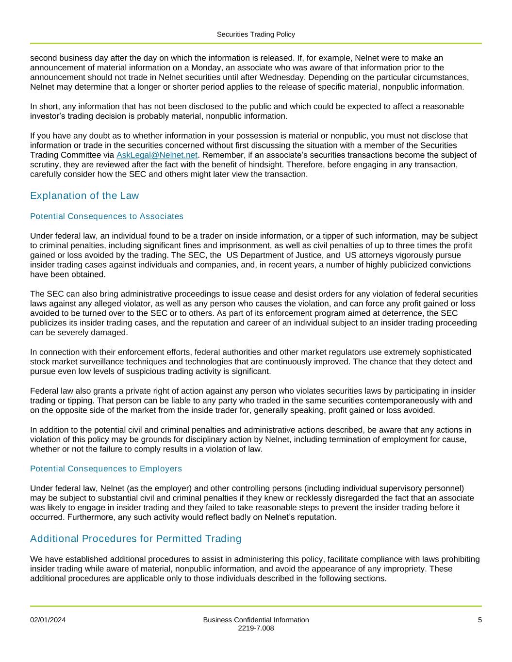 Securities Trading Policy 02/01/2024 Business Confidential Information 5 2219-7.008 second business day after the day on which the information is released. If, for example, Nelnet were to make an announcement of material information on a Monday, an associate who was aware of that information prior to the announcement should not trade in Nelnet securities until after Wednesday. Depending on the particular circumstances, Nelnet may determine that a longer or shorter period applies to the release of specific material, nonpublic information. In short, any information that has not been disclosed to the public and which could be expected to affect a reasonable investor’s trading decision is probably material, nonpublic information. If you have any doubt as to whether information in your possession is material or nonpublic, you must not disclose that information or trade in the securities concerned without first discussing the situation with a member of the Securities Trading Committee via AskLegal@Nelnet.net. Remember, if an associate’s securities transactions become the subject of scrutiny, they are reviewed after the fact with the benefit of hindsight. Therefore, before engaging in any transaction, carefully consider how the SEC and others might later view the transaction. Explanation of the Law Potential Consequences to Associates Under federal law, an individual found to be a trader on inside information, or a tipper of such information, may be subject to criminal penalties, including significant fines and imprisonment, as well as civil penalties of up to three times the profit gained or loss avoided by the trading. The SEC, the US Department of Justice, and US attorneys vigorously pursue insider trading cases against individuals and companies, and, in recent years, a number of highly publicized convictions have been obtained. The SEC can also bring administrative proceedings to issue cease and desist orders for any violation of federal securities laws against any alleged violator, as well as any person who causes the violation, and can force any profit gained or loss avoided to be turned over to the SEC or to others. As part of its enforcement program aimed at deterrence, the SEC publicizes its insider trading cases, and the reputation and career of an individual subject to an insider trading proceeding can be severely damaged. In connection with their enforcement efforts, federal authorities and other market regulators use extremely sophisticated stock market surveillance techniques and technologies that are continuously improved. The chance that they detect and pursue even low levels of suspicious trading activity is significant. Federal law also grants a private right of action against any person who violates securities laws by participating in insider trading or tipping. That person can be liable to any party who traded in the same securities contemporaneously with and on the opposite side of the market from the inside trader for, generally speaking, profit gained or loss avoided. In addition to the potential civil and criminal penalties and administrative actions described, be aware that any actions in violation of this policy may be grounds for disciplinary action by Nelnet, including termination of employment for cause, whether or not the failure to comply results in a violation of law. Potential Consequences to Employers Under federal law, Nelnet (as the employer) and other controlling persons (including individual supervisory personnel) may be subject to substantial civil and criminal penalties if they knew or recklessly disregarded the fact that an associate was likely to engage in insider trading and they failed to take reasonable steps to prevent the insider trading before it occurred. Furthermore, any such activity would reflect badly on Nelnet’s reputation. Additional Procedures for Permitted Trading We have established additional procedures to assist in administering this policy, facilitate compliance with laws prohibiting insider trading while aware of material, nonpublic information, and avoid the appearance of any impropriety. These additional procedures are applicable only to those individuals described in the following sections.