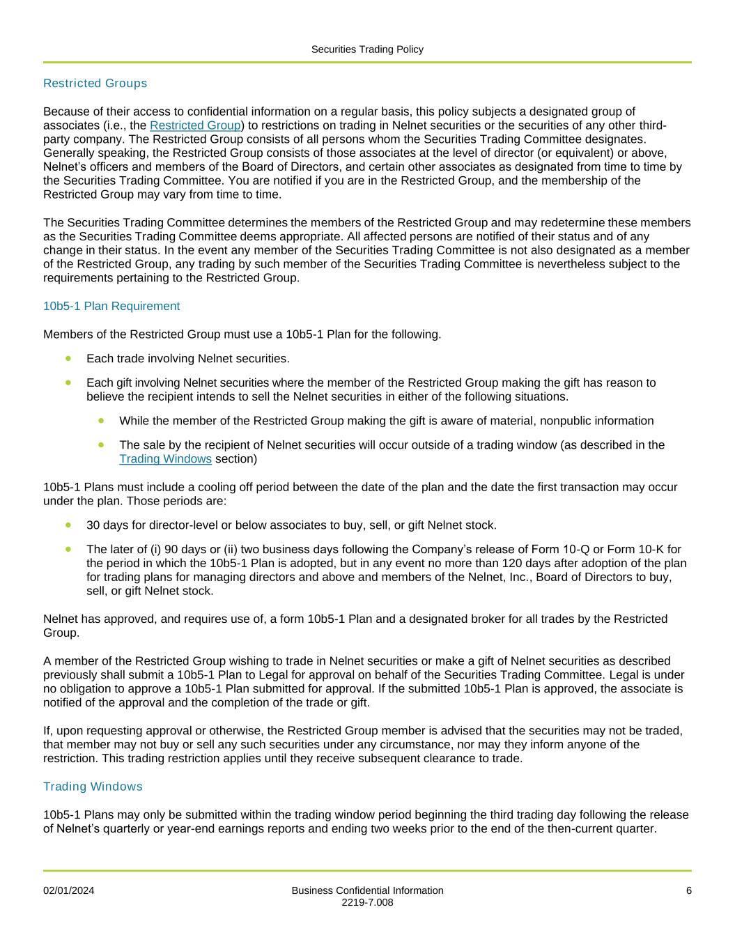 Securities Trading Policy 02/01/2024 Business Confidential Information 6 2219-7.008 Restricted Groups Because of their access to confidential information on a regular basis, this policy subjects a designated group of associates (i.e., the Restricted Group) to restrictions on trading in Nelnet securities or the securities of any other third- party company. The Restricted Group consists of all persons whom the Securities Trading Committee designates. Generally speaking, the Restricted Group consists of those associates at the level of director (or equivalent) or above, Nelnet’s officers and members of the Board of Directors, and certain other associates as designated from time to time by the Securities Trading Committee. You are notified if you are in the Restricted Group, and the membership of the Restricted Group may vary from time to time. The Securities Trading Committee determines the members of the Restricted Group and may redetermine these members as the Securities Trading Committee deems appropriate. All affected persons are notified of their status and of any change in their status. In the event any member of the Securities Trading Committee is not also designated as a member of the Restricted Group, any trading by such member of the Securities Trading Committee is nevertheless subject to the requirements pertaining to the Restricted Group. 10b5-1 Plan Requirement Members of the Restricted Group must use a 10b5-1 Plan for the following. • Each trade involving Nelnet securities. • Each gift involving Nelnet securities where the member of the Restricted Group making the gift has reason to believe the recipient intends to sell the Nelnet securities in either of the following situations. • While the member of the Restricted Group making the gift is aware of material, nonpublic information • The sale by the recipient of Nelnet securities will occur outside of a trading window (as described in the Trading Windows section) 10b5-1 Plans must include a cooling off period between the date of the plan and the date the first transaction may occur under the plan. Those periods are: • 30 days for director-level or below associates to buy, sell, or gift Nelnet stock. • The later of (i) 90 days or (ii) two business days following the Company’s release of Form 10-Q or Form 10-K for the period in which the 10b5-1 Plan is adopted, but in any event no more than 120 days after adoption of the plan for trading plans for managing directors and above and members of the Nelnet, Inc., Board of Directors to buy, sell, or gift Nelnet stock. Nelnet has approved, and requires use of, a form 10b5-1 Plan and a designated broker for all trades by the Restricted Group. A member of the Restricted Group wishing to trade in Nelnet securities or make a gift of Nelnet securities as described previously shall submit a 10b5-1 Plan to Legal for approval on behalf of the Securities Trading Committee. Legal is under no obligation to approve a 10b5-1 Plan submitted for approval. If the submitted 10b5-1 Plan is approved, the associate is notified of the approval and the completion of the trade or gift. If, upon requesting approval or otherwise, the Restricted Group member is advised that the securities may not be traded, that member may not buy or sell any such securities under any circumstance, nor may they inform anyone of the restriction. This trading restriction applies until they receive subsequent clearance to trade. Trading Windows 10b5-1 Plans may only be submitted within the trading window period beginning the third trading day following the release of Nelnet’s quarterly or year-end earnings reports and ending two weeks prior to the end of the then-current quarter.