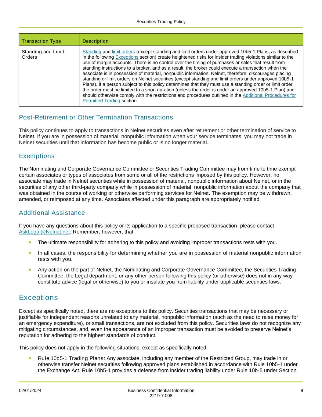 Securities Trading Policy 02/01/2024 Business Confidential Information 9 2219-7.008 Transaction Type Description Standing and Limit Orders Standing and limit orders (except standing and limit orders under approved 10b5-1 Plans, as described in the following Exceptions section) create heightened risks for insider trading violations similar to the use of margin accounts. There is no control over the timing of purchases or sales that result from standing instructions to a broker, and as a result, the broker could execute a transaction when the associate is in possession of material, nonpublic information. Nelnet, therefore, discourages placing standing or limit orders on Nelnet securities (except standing and limit orders under approved 10b5-1 Plans). If a person subject to this policy determines that they must use a standing order or limit order, the order must be limited to a short duration (unless the order is under an approved 10b5-1 Plan) and should otherwise comply with the restrictions and procedures outlined in the Additional Procedures for Permitted Trading section. Post-Retirement or Other Termination Transactions This policy continues to apply to transactions in Nelnet securities even after retirement or other termination of service to Nelnet. If you are in possession of material, nonpublic information when your service terminates, you may not trade in Nelnet securities until that information has become public or is no longer material. Exemptions The Nominating and Corporate Governance Committee or Securities Trading Committee may from time to time exempt certain associates or types of associates from some or all of the restrictions imposed by this policy. However, no associate may trade in Nelnet securities while in possession of material, nonpublic information about Nelnet, or in the securities of any other third-party company while in possession of material, nonpublic information about the company that was obtained in the course of working or otherwise performing services for Nelnet. The exemption may be withdrawn, amended, or reimposed at any time. Associates affected under this paragraph are appropriately notified. Additional Assistance If you have any questions about this policy or its application to a specific proposed transaction, please contact AskLegal@Nelnet.net. Remember, however, that: • The ultimate responsibility for adhering to this policy and avoiding improper transactions rests with you. • In all cases, the responsibility for determining whether you are in possession of material nonpublic information rests with you. • Any action on the part of Nelnet, the Nominating and Corporate Governance Committee, the Securities Trading Committee, the Legal department, or any other person following this policy (or otherwise) does not in any way constitute advice (legal or otherwise) to you or insulate you from liability under applicable securities laws. Exceptions Except as specifically noted, there are no exceptions to this policy. Securities transactions that may be necessary or justifiable for independent reasons unrelated to any material, nonpublic information (such as the need to raise money for an emergency expenditure), or small transactions, are not excluded from this policy. Securities laws do not recognize any mitigating circumstances, and, even the appearance of an improper transaction must be avoided to preserve Nelnet’s reputation for adhering to the highest standards of conduct. This policy does not apply in the following situations, except as specifically noted. • Rule 10b5-1 Trading Plans: Any associate, including any member of the Restricted Group, may trade in or otherwise transfer Nelnet securities following approved plans established in accordance with Rule 10b5-1 under the Exchange Act. Rule 10b5-1 provides a defense from insider trading liability under Rule 10b-5 under Section