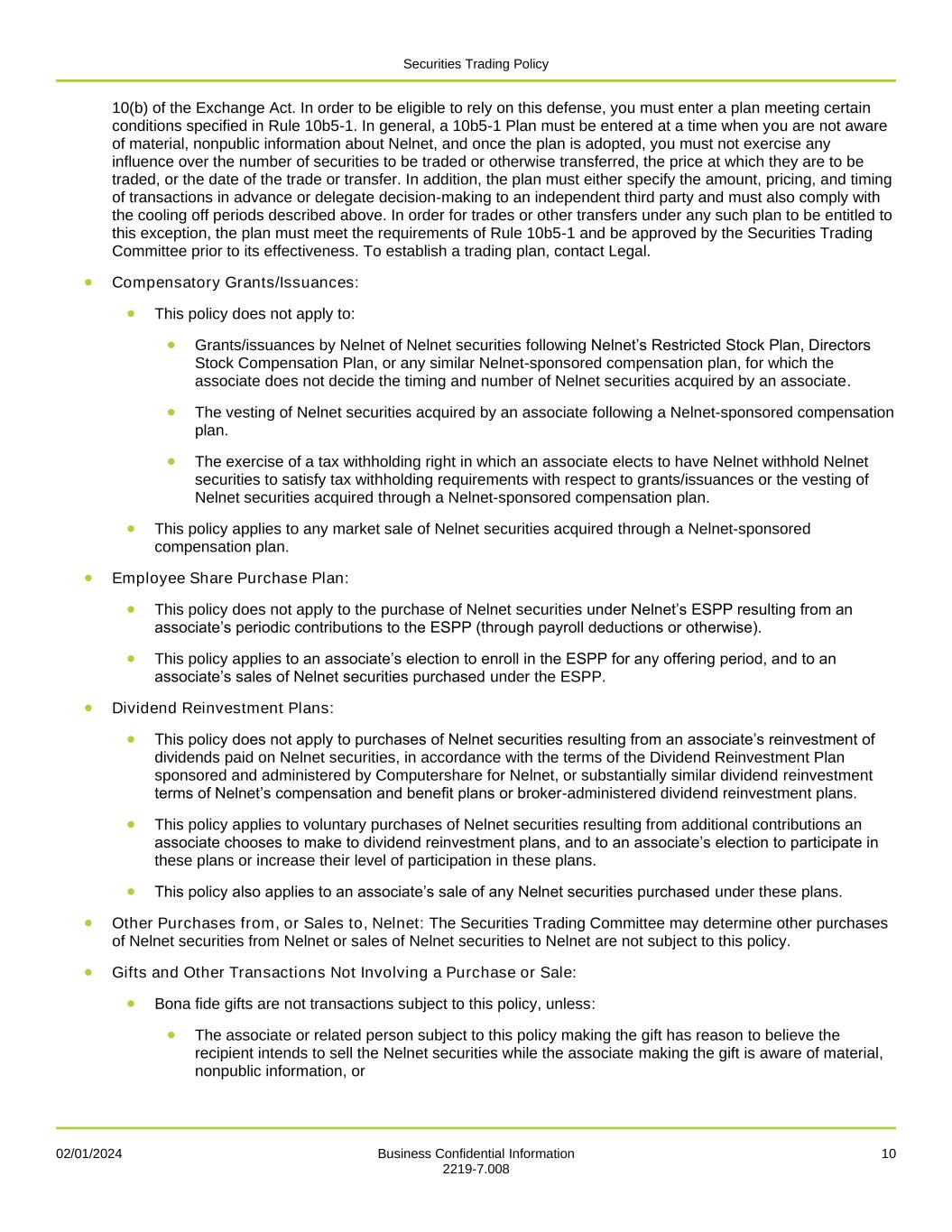 Securities Trading Policy 02/01/2024 Business Confidential Information 10 2219-7.008 10(b) of the Exchange Act. In order to be eligible to rely on this defense, you must enter a plan meeting certain conditions specified in Rule 10b5-1. In general, a 10b5-1 Plan must be entered at a time when you are not aware of material, nonpublic information about Nelnet, and once the plan is adopted, you must not exercise any influence over the number of securities to be traded or otherwise transferred, the price at which they are to be traded, or the date of the trade or transfer. In addition, the plan must either specify the amount, pricing, and timing of transactions in advance or delegate decision-making to an independent third party and must also comply with the cooling off periods described above. In order for trades or other transfers under any such plan to be entitled to this exception, the plan must meet the requirements of Rule 10b5-1 and be approved by the Securities Trading Committee prior to its effectiveness. To establish a trading plan, contact Legal. • Compensatory Grants/Issuances: • This policy does not apply to: • Grants/issuances by Nelnet of Nelnet securities following Nelnet’s Restricted Stock Plan, Directors Stock Compensation Plan, or any similar Nelnet-sponsored compensation plan, for which the associate does not decide the timing and number of Nelnet securities acquired by an associate. • The vesting of Nelnet securities acquired by an associate following a Nelnet-sponsored compensation plan. • The exercise of a tax withholding right in which an associate elects to have Nelnet withhold Nelnet securities to satisfy tax withholding requirements with respect to grants/issuances or the vesting of Nelnet securities acquired through a Nelnet-sponsored compensation plan. • This policy applies to any market sale of Nelnet securities acquired through a Nelnet-sponsored compensation plan. • Employee Share Purchase Plan: • This policy does not apply to the purchase of Nelnet securities under Nelnet’s ESPP resulting from an associate’s periodic contributions to the ESPP (through payroll deductions or otherwise). • This policy applies to an associate’s election to enroll in the ESPP for any offering period, and to an associate’s sales of Nelnet securities purchased under the ESPP. • Dividend Reinvestment Plans: • This policy does not apply to purchases of Nelnet securities resulting from an associate’s reinvestment of dividends paid on Nelnet securities, in accordance with the terms of the Dividend Reinvestment Plan sponsored and administered by Computershare for Nelnet, or substantially similar dividend reinvestment terms of Nelnet’s compensation and benefit plans or broker-administered dividend reinvestment plans. • This policy applies to voluntary purchases of Nelnet securities resulting from additional contributions an associate chooses to make to dividend reinvestment plans, and to an associate’s election to participate in these plans or increase their level of participation in these plans. • This policy also applies to an associate’s sale of any Nelnet securities purchased under these plans. • Other Purchases from, or Sales to, Nelnet: The Securities Trading Committee may determine other purchases of Nelnet securities from Nelnet or sales of Nelnet securities to Nelnet are not subject to this policy. • Gifts and Other Transactions Not Involving a Purchase or Sale: • Bona fide gifts are not transactions subject to this policy, unless: • The associate or related person subject to this policy making the gift has reason to believe the recipient intends to sell the Nelnet securities while the associate making the gift is aware of material, nonpublic information, or