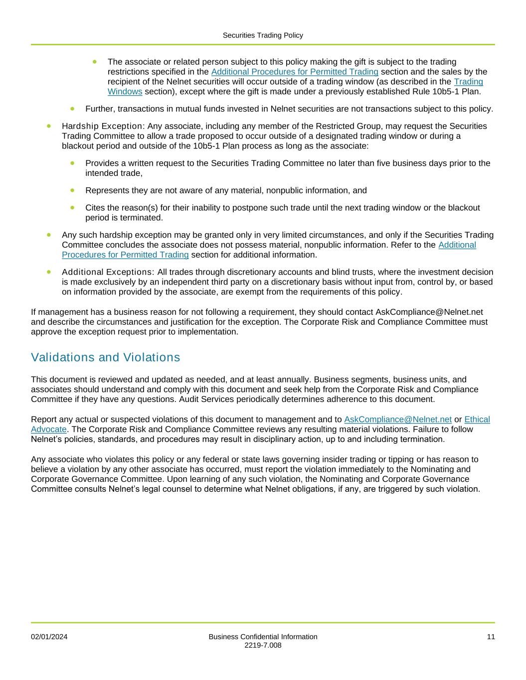 Securities Trading Policy 02/01/2024 Business Confidential Information 11 2219-7.008 • The associate or related person subject to this policy making the gift is subject to the trading restrictions specified in the Additional Procedures for Permitted Trading section and the sales by the recipient of the Nelnet securities will occur outside of a trading window (as described in the Trading Windows section), except where the gift is made under a previously established Rule 10b5-1 Plan. • Further, transactions in mutual funds invested in Nelnet securities are not transactions subject to this policy. • Hardship Exception: Any associate, including any member of the Restricted Group, may request the Securities Trading Committee to allow a trade proposed to occur outside of a designated trading window or during a blackout period and outside of the 10b5-1 Plan process as long as the associate: • Provides a written request to the Securities Trading Committee no later than five business days prior to the intended trade, • Represents they are not aware of any material, nonpublic information, and • Cites the reason(s) for their inability to postpone such trade until the next trading window or the blackout period is terminated. • Any such hardship exception may be granted only in very limited circumstances, and only if the Securities Trading Committee concludes the associate does not possess material, nonpublic information. Refer to the Additional Procedures for Permitted Trading section for additional information. • Additional Exceptions: All trades through discretionary accounts and blind trusts, where the investment decision is made exclusively by an independent third party on a discretionary basis without input from, control by, or based on information provided by the associate, are exempt from the requirements of this policy. If management has a business reason for not following a requirement, they should contact AskCompliance@Nelnet.net and describe the circumstances and justification for the exception. The Corporate Risk and Compliance Committee must approve the exception request prior to implementation. Validations and Violations This document is reviewed and updated as needed, and at least annually. Business segments, business units, and associates should understand and comply with this document and seek help from the Corporate Risk and Compliance Committee if they have any questions. Audit Services periodically determines adherence to this document. Report any actual or suspected violations of this document to management and to AskCompliance@Nelnet.net or Ethical Advocate. The Corporate Risk and Compliance Committee reviews any resulting material violations. Failure to follow Nelnet’s policies, standards, and procedures may result in disciplinary action, up to and including termination. Any associate who violates this policy or any federal or state laws governing insider trading or tipping or has reason to believe a violation by any other associate has occurred, must report the violation immediately to the Nominating and Corporate Governance Committee. Upon learning of any such violation, the Nominating and Corporate Governance Committee consults Nelnet’s legal counsel to determine what Nelnet obligations, if any, are triggered by such violation.