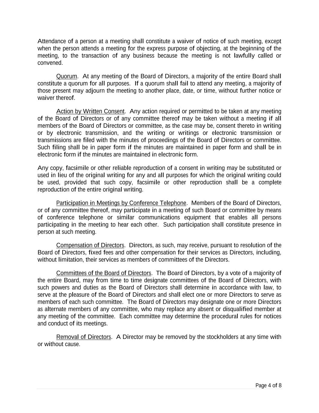 Page 4 of 8 Attendance of a person at a meeting shall constitute a waiver of notice of such meeting, except when the person attends a meeting for the express purpose of objecting, at the beginning of the meeting, to the transaction of any business because the meeting is not lawfully called or convened. Quorum. At any meeting of the Board of Directors, a majority of the entire Board shall constitute a quorum for all purposes. If a quorum shall fail to attend any meeting, a majority of those present may adjourn the meeting to another place, date, or time, without further notice or waiver thereof. Action by Written Consent. Any action required or permitted to be taken at any meeting of the Board of Directors or of any committee thereof may be taken without a meeting if all members of the Board of Directors or committee, as the case may be, consent thereto in writing or by electronic transmission, and the writing or writings or electronic transmission or transmissions are filed with the minutes of proceedings of the Board of Directors or committee. Such filing shall be in paper form if the minutes are maintained in paper form and shall be in electronic form if the minutes are maintained in electronic form. Any copy, facsimile or other reliable reproduction of a consent in writing may be substituted or used in lieu of the original writing for any and all purposes for which the original writing could be used, provided that such copy, facsimile or other reproduction shall be a complete reproduction of the entire original writing. Participation in Meetings by Conference Telephone. Members of the Board of Directors, or of any committee thereof, may participate in a meeting of such Board or committee by means of conference telephone or similar communications equipment that enables all persons participating in the meeting to hear each other. Such participation shall constitute presence in person at such meeting. Compensation of Directors. Directors, as such, may receive, pursuant to resolution of the Board of Directors, fixed fees and other compensation for their services as Directors, including, without limitation, their services as members of committees of the Directors. Committees of the Board of Directors. The Board of Directors, by a vote of a majority of the entire Board, may from time to time designate committees of the Board of Directors, with such powers and duties as the Board of Directors shall determine in accordance with law, to serve at the pleasure of the Board of Directors and shall elect one or more Directors to serve as members of each such committee. The Board of Directors may designate one or more Directors as alternate members of any committee, who may replace any absent or disqualified member at any meeting of the committee. Each committee may determine the procedural rules for notices and conduct of its meetings. Removal of Directors. A Director may be removed by the stockholders at any time with or without cause.