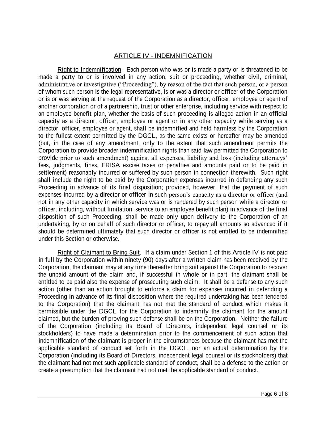 Page 6 of 8 ARTICLE IV - INDEMNIFICATION Right to Indemnification. Each person who was or is made a party or is threatened to be made a party to or is involved in any action, suit or proceeding, whether civil, criminal, administrative or investigative (“Proceeding”), by reason of the fact that such person, or a person of whom such person is the legal representative, is or was a director or officer of the Corporation or is or was serving at the request of the Corporation as a director, officer, employee or agent of another corporation or of a partnership, trust or other enterprise, including service with respect to an employee benefit plan, whether the basis of such proceeding is alleged action in an official capacity as a director, officer, employee or agent or in any other capacity while serving as a director, officer, employee or agent, shall be indemnified and held harmless by the Corporation to the fullest extent permitted by the DGCL, as the same exists or hereafter may be amended (but, in the case of any amendment, only to the extent that such amendment permits the Corporation to provide broader indemnification rights than said law permitted the Corporation to provide prior to such amendment) against all expenses, liability and loss (including attorneys’ fees, judgments, fines, ERISA excise taxes or penalties and amounts paid or to be paid in settlement) reasonably incurred or suffered by such person in connection therewith. Such right shall include the right to be paid by the Corporation expenses incurred in defending any such Proceeding in advance of its final disposition; provided, however, that the payment of such expenses incurred by a director or officer in such person’s capacity as a director or officer (and not in any other capacity in which service was or is rendered by such person while a director or officer, including, without limitation, service to an employee benefit plan) in advance of the final disposition of such Proceeding, shall be made only upon delivery to the Corporation of an undertaking, by or on behalf of such director or officer, to repay all amounts so advanced if it should be determined ultimately that such director or officer is not entitled to be indemnified under this Section or otherwise. Right of Claimant to Bring Suit. If a claim under Section 1 of this Article IV is not paid in full by the Corporation within ninety (90) days after a written claim has been received by the Corporation, the claimant may at any time thereafter bring suit against the Corporation to recover the unpaid amount of the claim and, if successful in whole or in part, the claimant shall be entitled to be paid also the expense of prosecuting such claim. It shall be a defense to any such action (other than an action brought to enforce a claim for expenses incurred in defending a Proceeding in advance of its final disposition where the required undertaking has been tendered to the Corporation) that the claimant has not met the standard of conduct which makes it permissible under the DGCL for the Corporation to indemnify the claimant for the amount claimed, but the burden of proving such defense shall be on the Corporation. Neither the failure of the Corporation (including its Board of Directors, independent legal counsel or its stockholders) to have made a determination prior to the commencement of such action that indemnification of the claimant is proper in the circumstances because the claimant has met the applicable standard of conduct set forth in the DGCL, nor an actual determination by the Corporation (including its Board of Directors, independent legal counsel or its stockholders) that the claimant had not met such applicable standard of conduct, shall be a defense to the action or create a presumption that the claimant had not met the applicable standard of conduct.