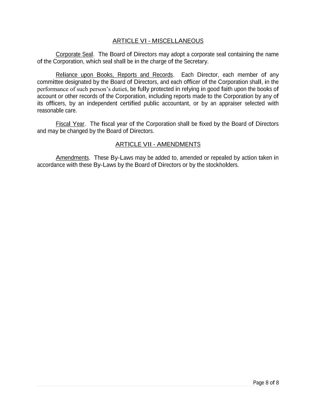 Page 8 of 8 ARTICLE VI - MISCELLANEOUS Corporate Seal. The Board of Directors may adopt a corporate seal containing the name of the Corporation, which seal shall be in the charge of the Secretary. Reliance upon Books, Reports and Records. Each Director, each member of any committee designated by the Board of Directors, and each officer of the Corporation shall, in the performance of such person’s duties, be fully protected in relying in good faith upon the books of account or other records of the Corporation, including reports made to the Corporation by any of its officers, by an independent certified public accountant, or by an appraiser selected with reasonable care. Fiscal Year. The fiscal year of the Corporation shall be fixed by the Board of Directors and may be changed by the Board of Directors. ARTICLE VII - AMENDMENTS Amendments. These By-Laws may be added to, amended or repealed by action taken in accordance with these By-Laws by the Board of Directors or by the stockholders.