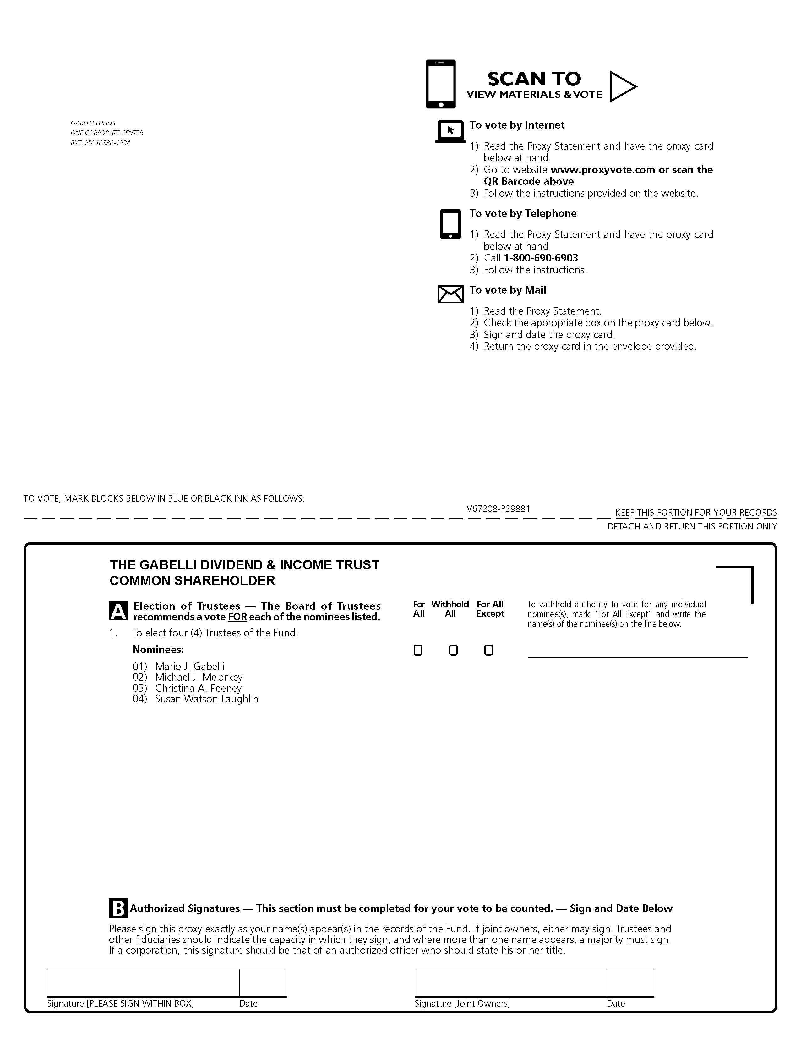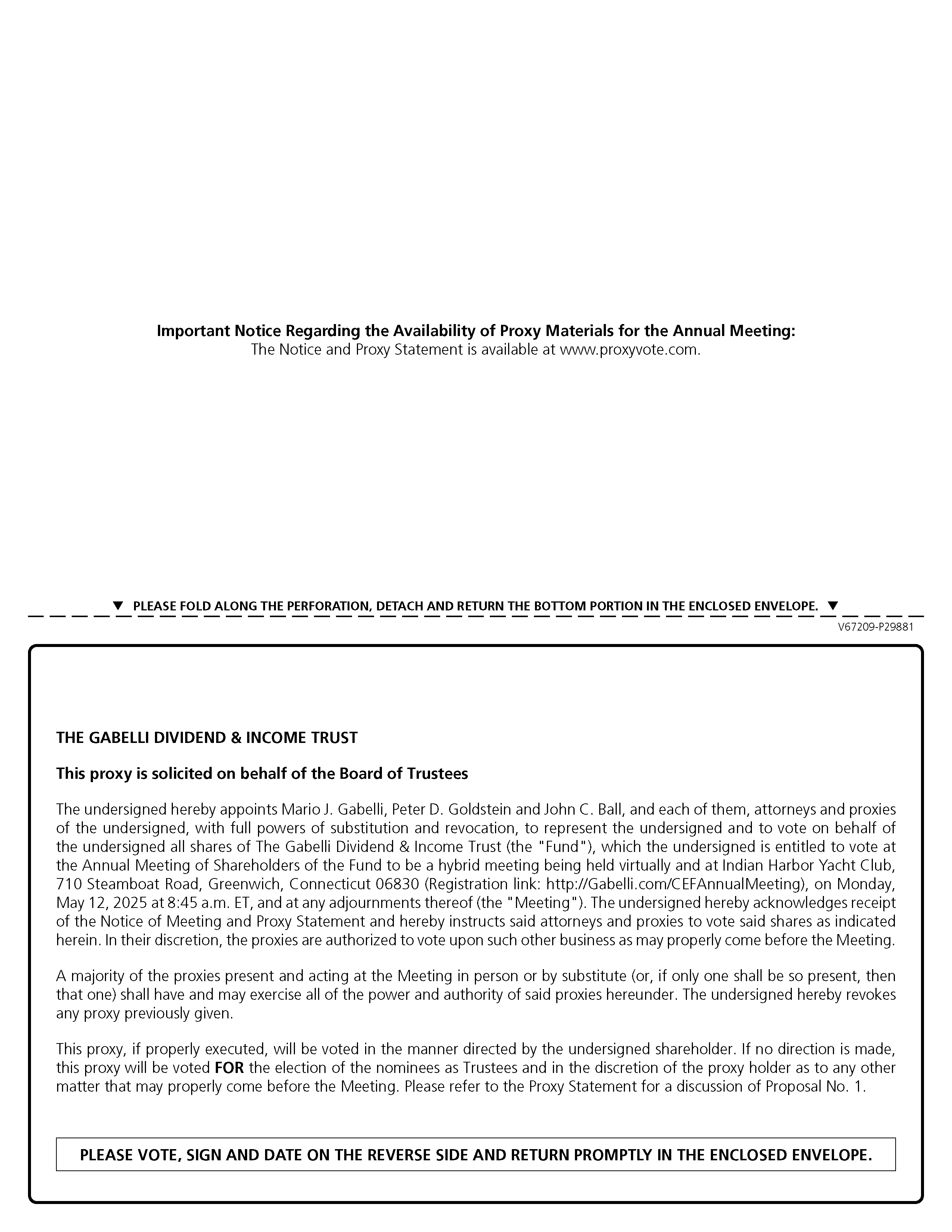 Notice is hereby given that the Annual Meeting of Shareholders of The Gabelli Dividend & Income Trust, a Delaware statutory trust (the “Fund”), will be held on Monday, May 12, 2025, at 8:45 a.m., ET, at Indian Harbor Yacht Club, 710 Steamboat Road, Greenwich, Connecticut, 06830 and virtually by Internet webcast (the “Meeting”), and at any adjournments or postponements thereof for the following purposes: