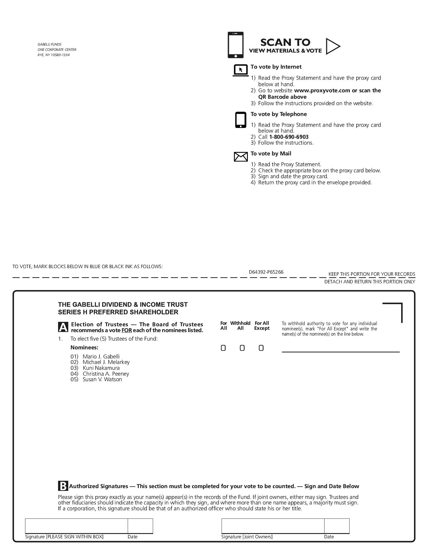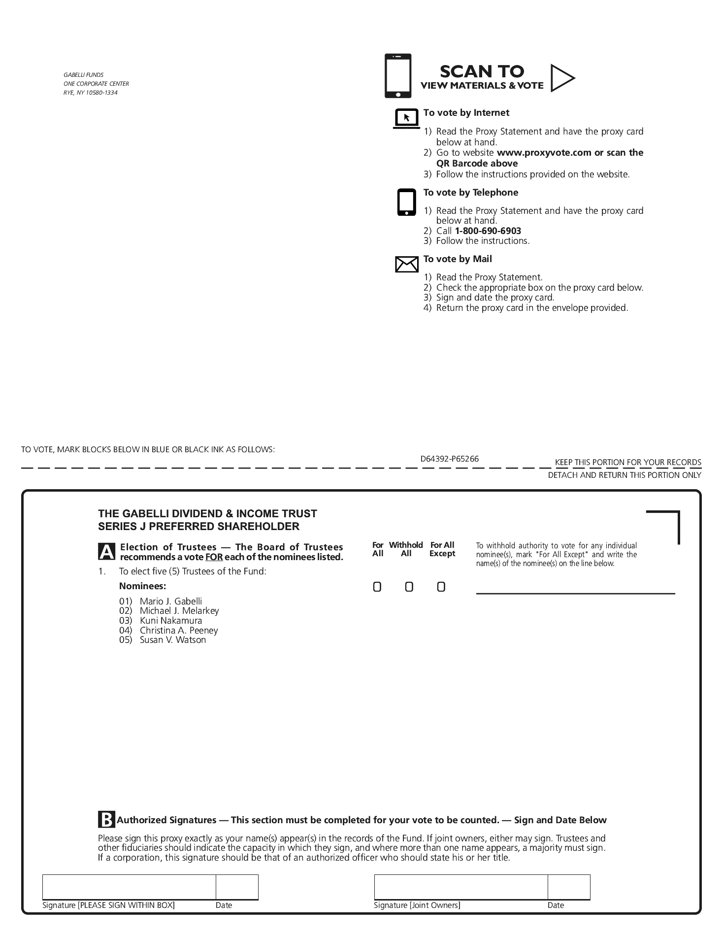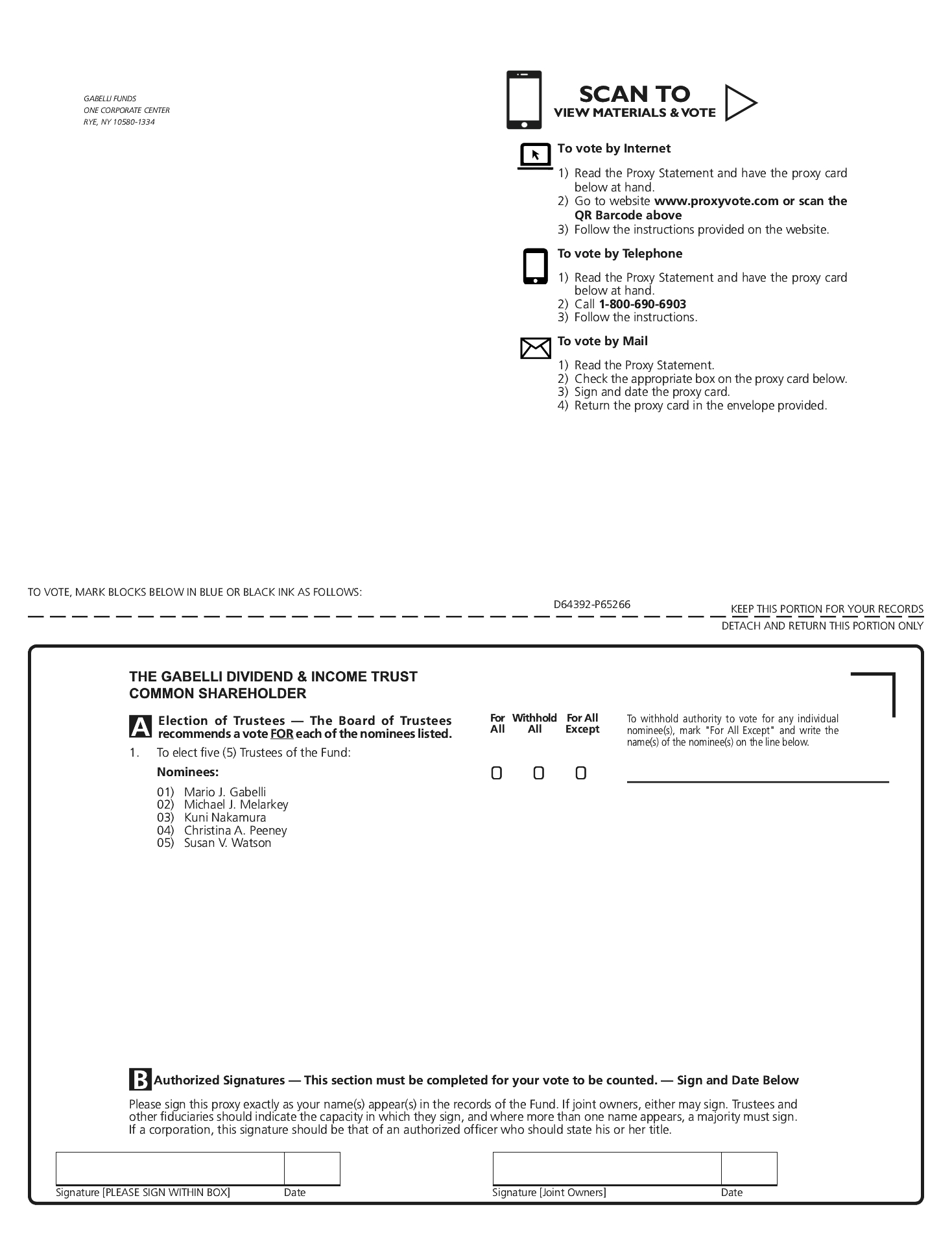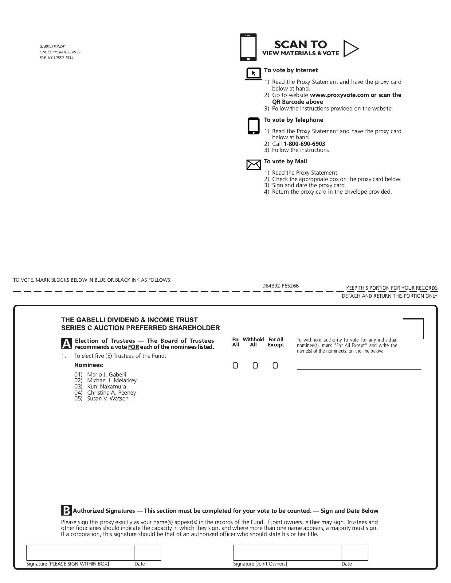 Election of Trustees | | | Common and Preferred Shareholders, voting together as a single class, vote to elect five Trustees: Mario J. Gabelli, Michael J. Melarkey, Kuni Nakamura, Christina A. Peeney, and Susan V. Watson | | | Common and Preferred Shareholders, voting together as a single class, vote to elect five Trustees:Mario J. Gabelli, Michael J. Melarkey, Kuni Nakamura, Christina A. Peeney, and Susan V. Watson |