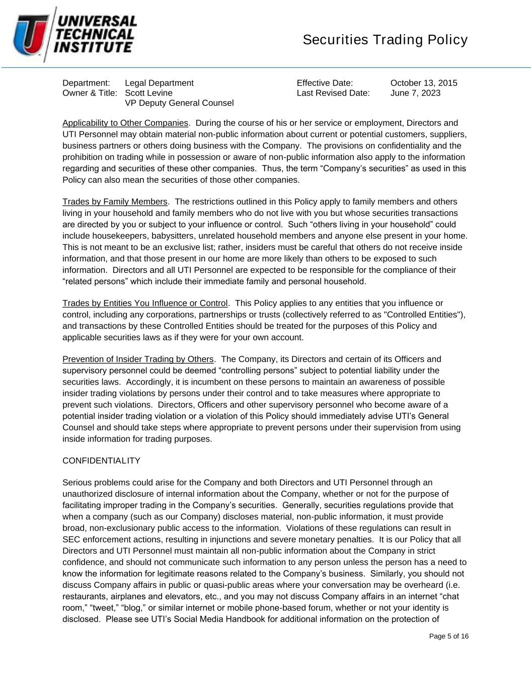 Securities Trading Policy Department: Legal Department Effective Date: October 13, 2015 Owner & Title: Scott Levine Last Revised Date: June 7, 2023 VP Deputy General Counsel Page 1 of 16 Purpose and Scope The purpose of this Policy is to promote compliance with applicable securities laws by Universal Technical Institute, Inc. (the “Company”) and its subsidiaries, members of the Company’s Board of Directors (“Directors”), and employees of the Company and its subsidiaries (collectively “UTI Personnel”). This Policy prohibits Directors and all UTI Personnel who possess material non-public information about the Company from engaging in insider trading, sets forth certain procedures that apply to securities transactions by the Directors and certain UTI Personnel, and restricts certain activities with respect to the securities of the Company. This Policy also affects family members, other members of a person's household and entities controlled by a person covered by this Policy, as described below, and may apply after your termination of employment. Policy Information WHAT IS INSIDER TRADING? Insider trading is, in addition to being a violation of the Company’s Policy, a violation of securities laws. The penalties for insider trading are discussed below. The term “insider trading” generally refers to (1) trading in securities while in possession or aware of material non-public information, or (2) communication of material non-public information to others who may trade while in possession or aware of such information. This means no person subject to the Company’s Policy who is aware of material non-public information relating to the Company may, directly or indirectly (through family members or other persons or entities) do any of the following: • Trade in Company securities. • Advise any other person to trade in Company securities or make recommendations to trade. • Communicate non-public information concerning the Company to others who may then trade in the Company’s stock or pass on the information to others who may trade in the Company’s stock. This conduct is known as “tipping.” • Assist others engaged in any of these activities, or otherwise engage in an action to take personal advantage of that information. WHO IS AN INSIDER? The concept of “insider” is broad and generally includes any person who possesses non-public information about the Company and who has a duty to the Company to keep this information confidential. In the case of the Company, insiders include Directors of the Company and its affiliates and subsidiaries, as well as all UTI Personnel who have access to material information that is not publicly available or who work on significant corporate transactions or projects. In addition, a person can be a “temporary insider” if he or she enters into a relationship to serve the Company and as a result is given access to information in