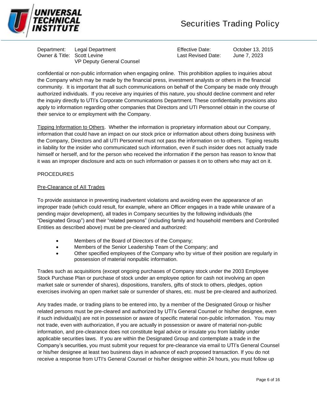 Securities Trading Policy Department: Legal Department Effective Date: October 13, 2015 Owner & Title: Scott Levine Last Revised Date: June 7, 2023 VP Deputy General Counsel Page 6 of 16 confidential or non-public information when engaging online. This prohibition applies to inquiries about the Company which may be made by the financial press, investment analysts or others in the financial community. It is important that all such communications on behalf of the Company be made only through authorized individuals. If you receive any inquiries of this nature, you should decline comment and refer the inquiry directly to UTI’s Corporate Communications Department. These confidentiality provisions also apply to information regarding other companies that Directors and UTI Personnel obtain in the course of their service to or employment with the Company. Tipping Information to Others. Whether the information is proprietary information about our Company, information that could have an impact on our stock price or information about others doing business with the Company, Directors and all UTI Personnel must not pass the information on to others. Tipping results in liability for the insider who communicated such information, even if such insider does not actually trade himself or herself, and for the person who received the information if the person has reason to know that it was an improper disclosure and acts on such information or passes it on to others who may act on it. PROCEDURES Pre-Clearance of All Trades To provide assistance in preventing inadvertent violations and avoiding even the appearance of an improper trade (which could result, for example, where an Officer engages in a trade while unaware of a pending major development), all trades in Company securities by the following individuals (the “Designated Group”) and their “related persons” (including family and household members and Controlled Entities as described above) must be pre-cleared and authorized: • Members of the Board of Directors of the Company; • Members of the Senior Leadership Team of the Company; and • Other specified employees of the Company who by virtue of their position are regularly in possession of material nonpublic information. Trades such as acquisitions (except ongoing purchases of Company stock under the 2003 Employee Stock Purchase Plan or purchase of stock under an employee option for cash not involving an open market sale or surrender of shares), dispositions, transfers, gifts of stock to others, pledges, option exercises involving an open market sale or surrender of shares, etc. must be pre-cleared and authorized. Any trades made, or trading plans to be entered into, by a member of the Designated Group or his/her related persons must be pre-cleared and authorized by UTI’s General Counsel or his/her designee, even if such individual(s) are not in possession or aware of specific material non-public information. You may not trade, even with authorization, if you are actually in possession or aware of material non-public information, and pre-clearance does not constitute legal advice or insulate you from liability under applicable securities laws. If you are within the Designated Group and contemplate a trade in the Company’s securities, you must submit your request for pre-clearance via email to UTI’s General Counsel or his/her designee at least two business days in advance of each proposed transaction. If you do not receive a response from UTI's General Counsel or his/her designee within 24 hours, you must follow up
