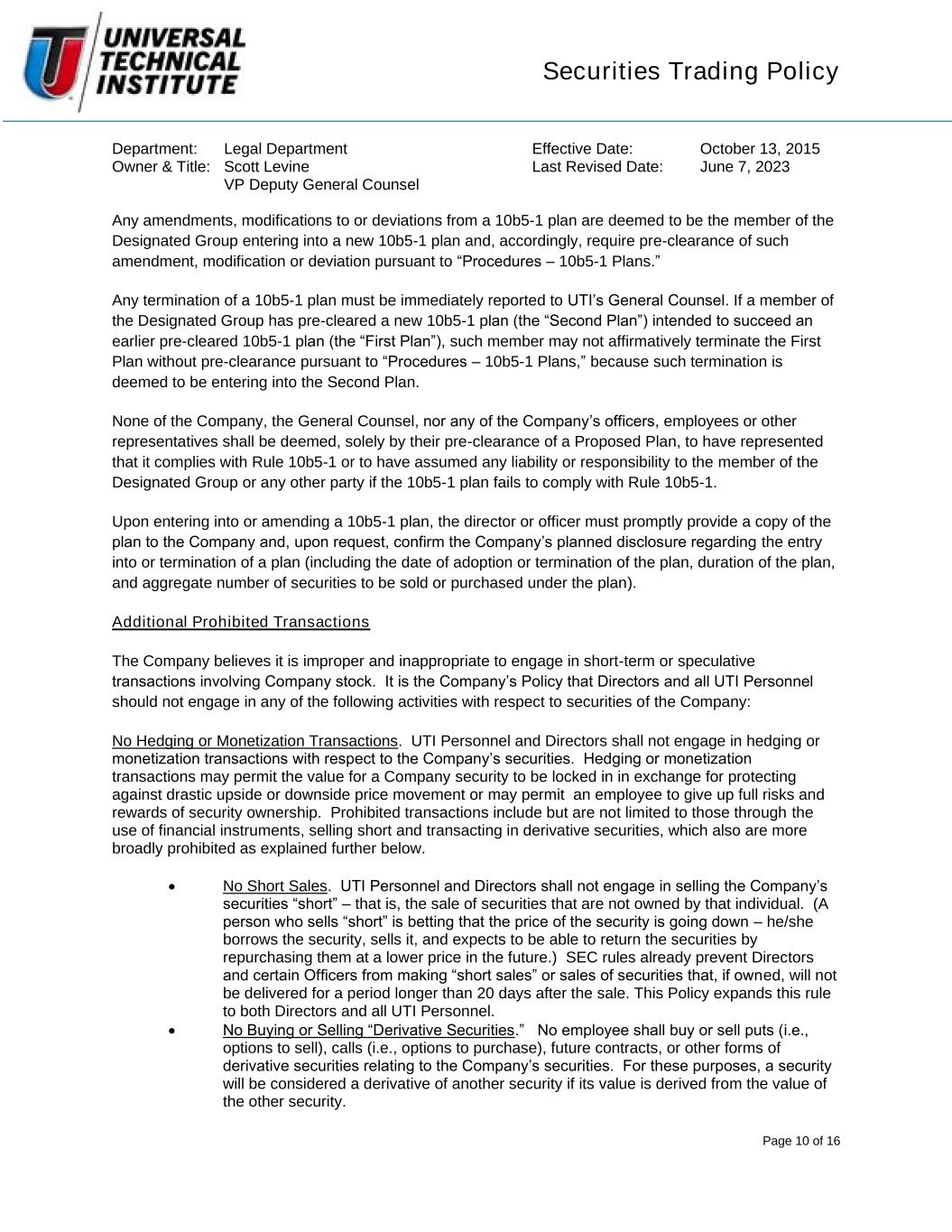 Securities Trading Policy Department: Legal Department Effective Date: October 13, 2015 Owner & Title: Scott Levine Last Revised Date: June 7, 2023 VP Deputy General Counsel Page 12 of 16 Post-Termination Transactions This Policy continues to apply to you even after termination of service to or employment with the Company. If you are in possession of material non-public information when your service or employment terminates, you may not trade in Company securities (or securities of another Company) until that information has become public or is no longer material and may not engage in any other action to take advantage of, or pass on to others, that information. Reminders EVEN IF YOU RECEIVE PRE-CLEARANCE AND IT IS DURING AN OPEN WINDOW PERIOD, YOU, ANY COMPANY, TRUST OR ENTITY CONTROLLED BY YOU, YOUR SPOUSE AND YOUR FAMILY MEMBERS AND OTHERS LIVING IN YOUR HOUSEHOLD MAY NOT TRADE IN SECURITIES OF UNIVERSAL TECHNICAL INSTITUTE, INC. IF YOU ARE IN POSSESSION OR AWARE OF MATERIAL, NON-PUBLIC INFORMATION ABOUT UNIVERSAL TECHNICAL INSTITUTE, INC. A violation of this Securities Trading Policy may subject the individual(s) to disciplinary action, up to and including employment termination, whether or not the Policy violation results in a violation of law or external proceedings. Frequently Asked Questions WHEN CAN I BUY OR SELL UTI STOCK? If you are a member of the Designated Group, you can only trade during the permitted “open window” periods. The permitted open window period begins the 2nd business day following the issuance of the Company’s press release of its quarterly and annual financial results and continues through the last day of the quarter. When the last day of a quarter falls on a weekend or holiday, the window will close at the close of business on the preceding business day. However, you cannot buy or sell UTI stock during permitted open window periods if you know material, non-public information. Generally, members of the Designated Group receive a memo from UTI’s General Counsel or his/her designee near the end of each quarter that indicates when the permitted window period is closing and when it will reopen. DO I HAVE TO NOTIFY ANYONE BEFORE BUYING OR SELLING UTI STOCK OR BEFORE EXERCISING UTI STOCK OPTIONS? All employees that are members of the Designated Group (including, without limitation, all Section 16 reporting persons) must notify UTI’s General Counsel or his/her designee in writing or via email at least two (2) business days before trading UTI stock or exercising UTI stock options. You may not complete the transaction unless it has been cleared in advance by UTI’s General Counsel or his/her designee. Section 16 reporting persons must also notify UTI’s General Counsel by the close of business on the date of any transaction so that appropriate SEC forms can be prepared and filed. Generally, Section 16 reporting persons are limited to the most senior members of management and board members.