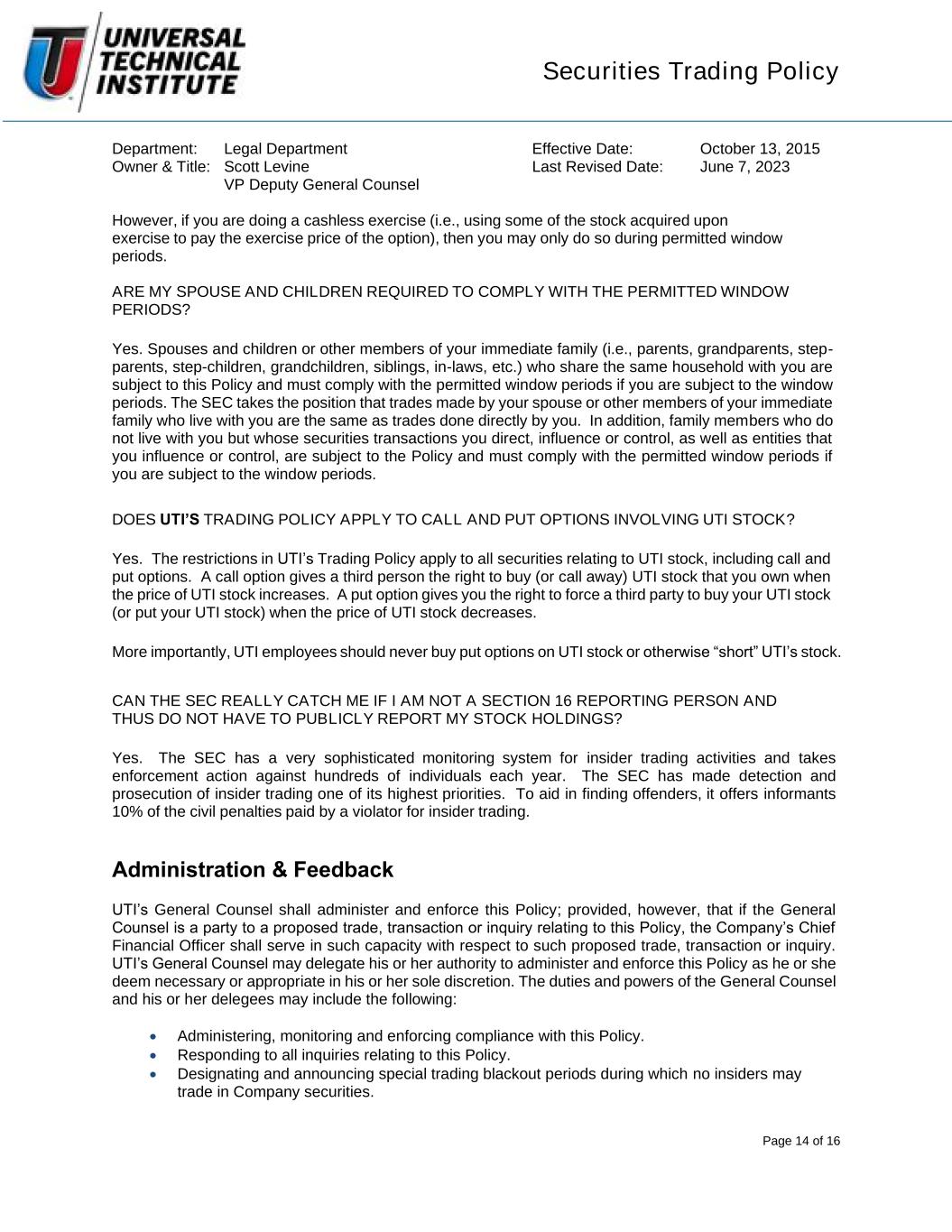 Securities Trading Policy Department: Legal Department Effective Date: October 13, 2015 Owner & Title: Scott Levine Last Revised Date: June 7, 2023 VP Deputy General Counsel Page 14 of 16 However, if you are doing a cashless exercise (i.e., using some of the stock acquired upon exercise to pay the exercise price of the option), then you may only do so during permitted window periods. ARE MY SPOUSE AND CHILDREN REQUIRED TO COMPLY WITH THE PERMITTED WINDOW PERIODS? Yes. Spouses and children or other members of your immediate family (i.e., parents, grandparents, step- parents, step-children, grandchildren, siblings, in-laws, etc.) who share the same household with you are subject to this Policy and must comply with the permitted window periods if you are subject to the window periods. The SEC takes the position that trades made by your spouse or other members of your immediate family who live with you are the same as trades done directly by you. In addition, family members who do not live with you but whose securities transactions you direct, influence or control, as well as entities that you influence or control, are subject to the Policy and must comply with the permitted window periods if you are subject to the window periods. DOES UTI’S TRADING POLICY APPLY TO CALL AND PUT OPTIONS INVOLVING UTI STOCK? Yes. The restrictions in UTI’s Trading Policy apply to all securities relating to UTI stock, including call and put options. A call option gives a third person the right to buy (or call away) UTI stock that you own when the price of UTI stock increases. A put option gives you the right to force a third party to buy your UTI stock (or put your UTI stock) when the price of UTI stock decreases. More importantly, UTI employees should never buy put options on UTI stock or otherwise “short” UTI’s stock. CAN THE SEC REALLY CATCH ME IF I AM NOT A SECTION 16 REPORTING PERSON AND THUS DO NOT HAVE TO PUBLICLY REPORT MY STOCK HOLDINGS? Yes. The SEC has a very sophisticated monitoring system for insider trading activities and takes enforcement action against hundreds of individuals each year. The SEC has made detection and prosecution of insider trading one of its highest priorities. To aid in finding offenders, it offers informants 10% of the civil penalties paid by a violator for insider trading. Administration & Feedback UTI’s General Counsel shall administer and enforce this Policy; provided, however, that if the General Counsel is a party to a proposed trade, transaction or inquiry relating to this Policy, the Company’s Chief Financial Officer shall serve in such capacity with respect to such proposed trade, transaction or inquiry. UTI’s General Counsel may delegate his or her authority to administer and enforce this Policy as he or she deem necessary or appropriate in his or her sole discretion. The duties and powers of the General Counsel and his or her delegees may include the following: • Administering, monitoring and enforcing compliance with this Policy. • Responding to all inquiries relating to this Policy. • Designating and announcing special trading blackout periods during which no insiders may trade in Company securities.