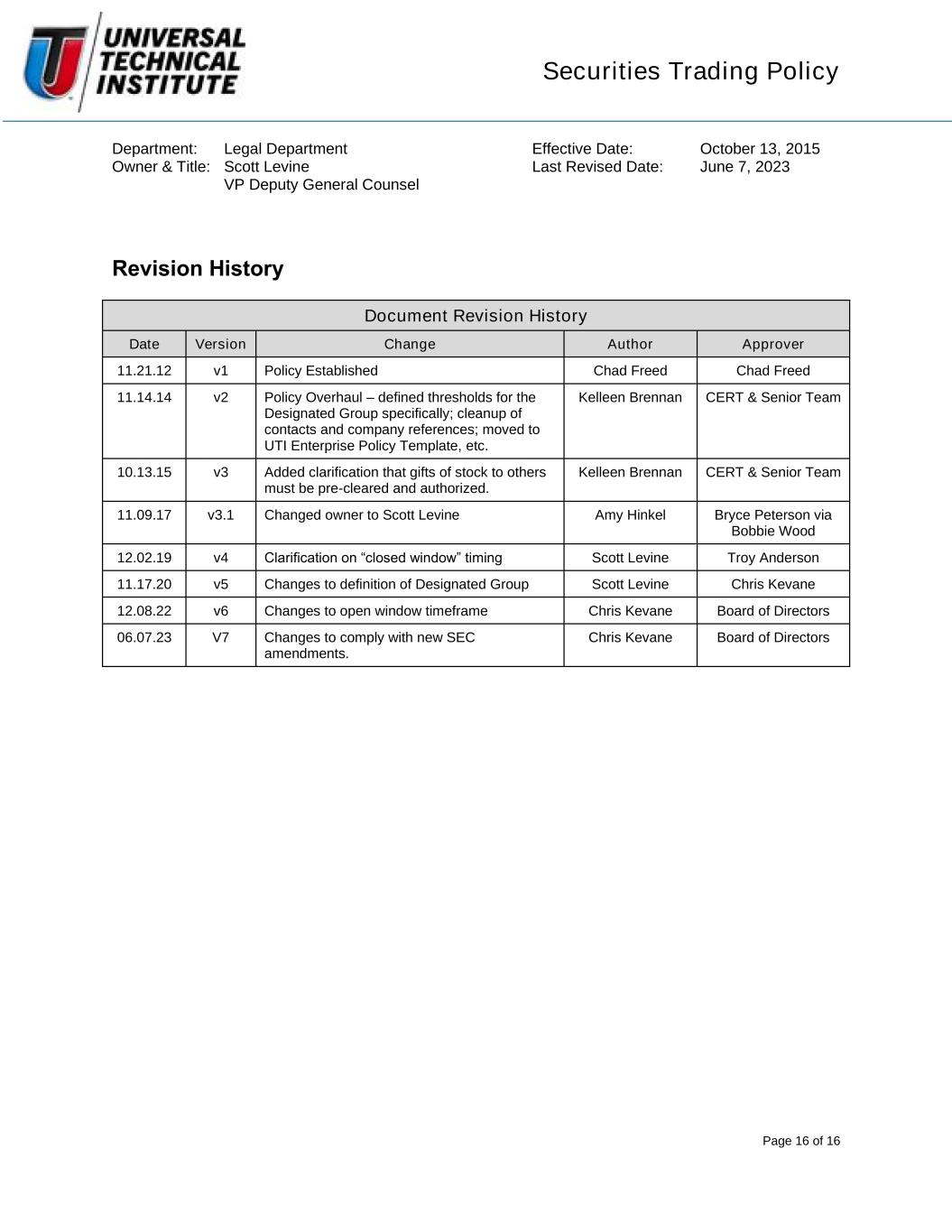 Securities Trading Policy Department: Legal Department Effective Date: October 13, 2015 Owner & Title: Scott Levine Last Revised Date: June 7, 2023 VP Deputy General Counsel Page 16 of 16 Revision History Document Revision History Date Version Change Author Approver 11.21.12 v1 Policy Established Chad Freed Chad Freed 11.14.14 v2 Policy Overhaul – defined thresholds for the Designated Group specifically; cleanup of contacts and company references; moved to UTI Enterprise Policy Template, etc. Kelleen Brennan CERT & Senior Team 10.13.15 v3 Added clarification that gifts of stock to others must be pre-cleared and authorized. Kelleen Brennan CERT & Senior Team 11.09.17 v3.1 Changed owner to Scott Levine Amy Hinkel Bryce Peterson via Bobbie Wood 12.02.19 v4 Clarification on “closed window” timing Scott Levine Troy Anderson 11.17.20 v5 Changes to definition of Designated Group Scott Levine Chris Kevane 12.08.22 v6 Changes to open window timeframe Chris Kevane Board of Directors 06.07.23 V7 Changes to comply with new SEC amendments. Chris Kevane Board of Directors