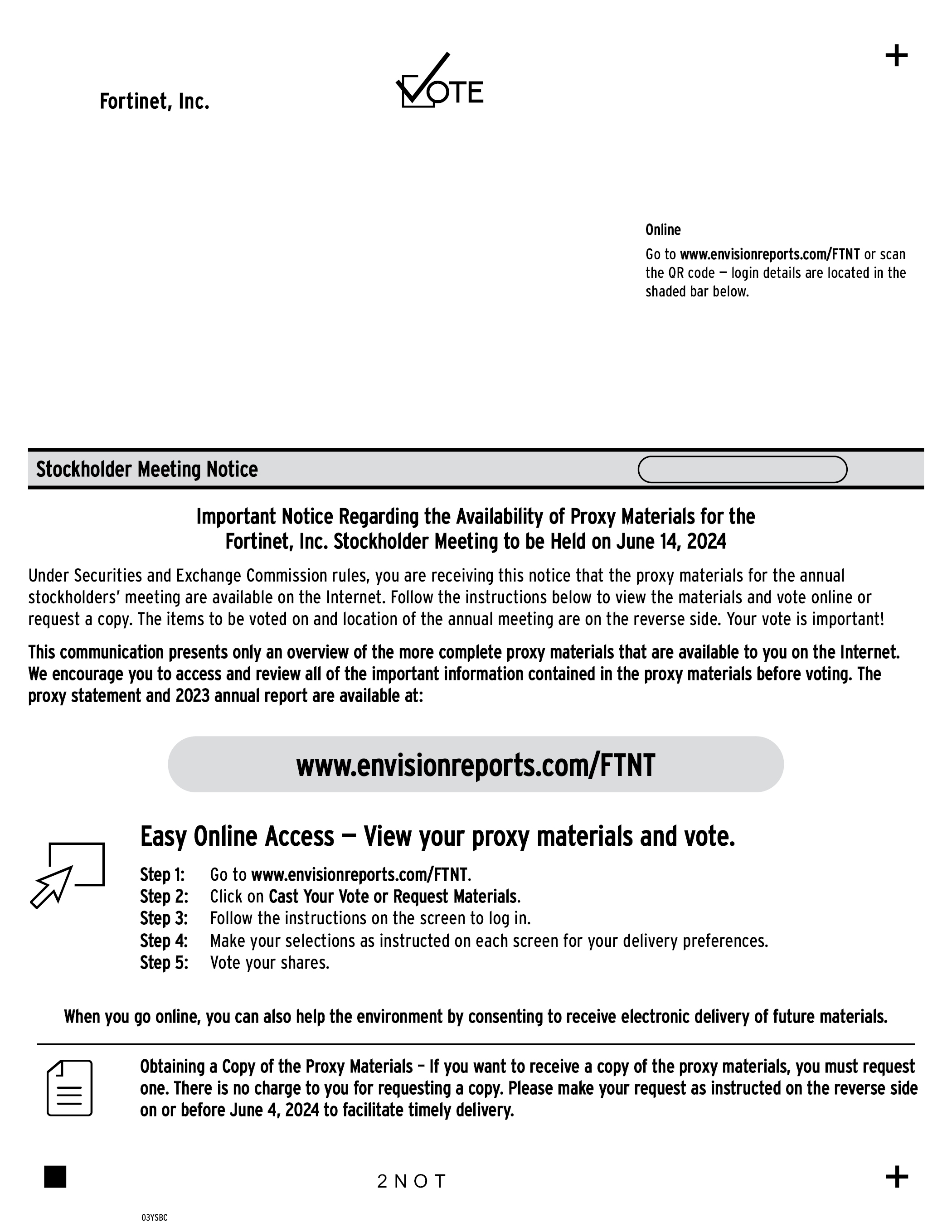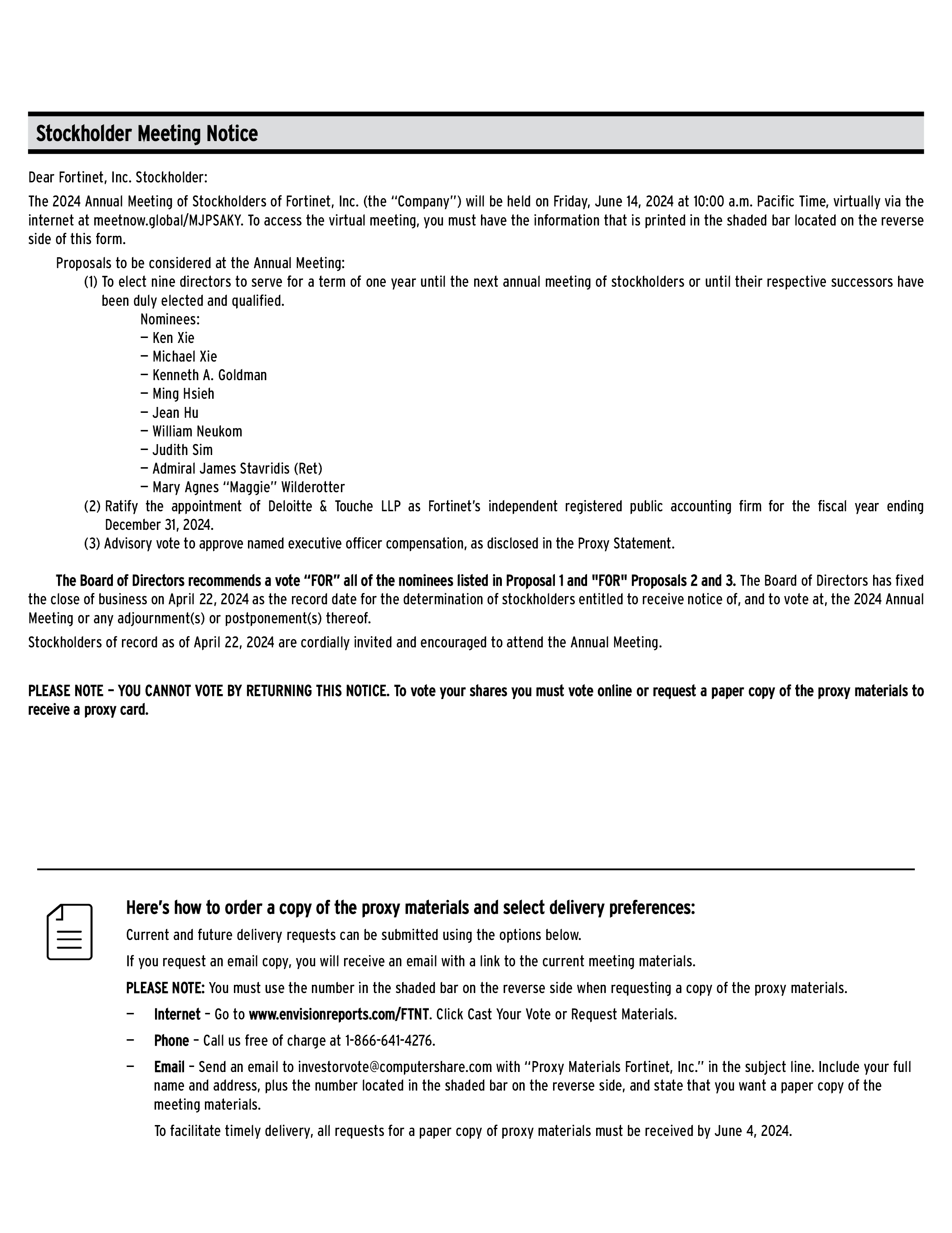 Here’s how to order a copy of the proxy materials and select delivery preferences: Current and future delivery requests can be submitted using the options below. If you request an email copy, you will receive an email with a link to the current meeting materials. PLEASE NOTE: You must use the number in the shaded bar on the reverse side when requesting a copy of the proxy materials. — Internet – Go to www.envisionreports.com/FTNT. Click Cast Your Vote or Request Materials. — Phone – Call us free of charge at 1-866-641-4276. — Email – Send an email to investorvote@computershare.com with “Proxy Materials Fortinet, Inc.” in the subject line. Include your full name and address, plus the number located in the shaded bar on the reverse side, and state that you want a paper copy of the meeting materials. To facilitate timely delivery, all requests for a paper copy of proxy materials must be received by June 4, 2024. Dear Fortinet, Inc. Stockholder: The 2024 Annual Meeting of Stockholders of Fortinet, Inc. (the “Company”) will be held on Friday, June 14, 2024 at 10:00 a.m. Pacific Time, virtually via the internet at meetnow.global/MJPSAKY. To access the virtual meeting, you must have the information that is printed in the shaded bar located on the reverse side of this form. Proposals to be considered at the Annual Meeting: (1) To elect nine directors to serve for a term of one year until the next annual meeting of stockholders or until their respective successors have been duly elected and qualified. Nominees: — Ken Xie — Michael Xie — Kenneth A. Goldman — Ming Hsieh — Jean Hu — William Neukom — Judith Sim — Admiral James Stavridis (Ret) — Mary Agnes “Maggie” Wilderotter (2) Ratify the appointment of Deloitte & Touche LLP as Fortinet’s independent registered public accounting firm for the fiscal year ending December 31, 2024. (3) Advisory vote to approve named executive officer compensation, as disclosed in the Proxy Statement. The Board of Directors recommends a vote “FOR” all of the nominees listed in Proposal 1 and “FOR” Proposals 2 and 3. The Board of Directors has fixed the close of business on April 22, 2024 as the record date for the determination of stockholders entitled to receive notice of, and to vote at, the 2024 Annual Meeting or any adjournment(s) or postponement(s) thereof. Stockholders of record as of April 22, 2024 are cordially invited and encouraged to attend the Annual Meeting. PLEASE NOTE – YOU CANNOT VOTE BY RETURNING THIS NOTICE. To vote your shares you must vote online or request a paper copy of the proxy materials to receive a proxy card. Stockholder Meeting Notice
