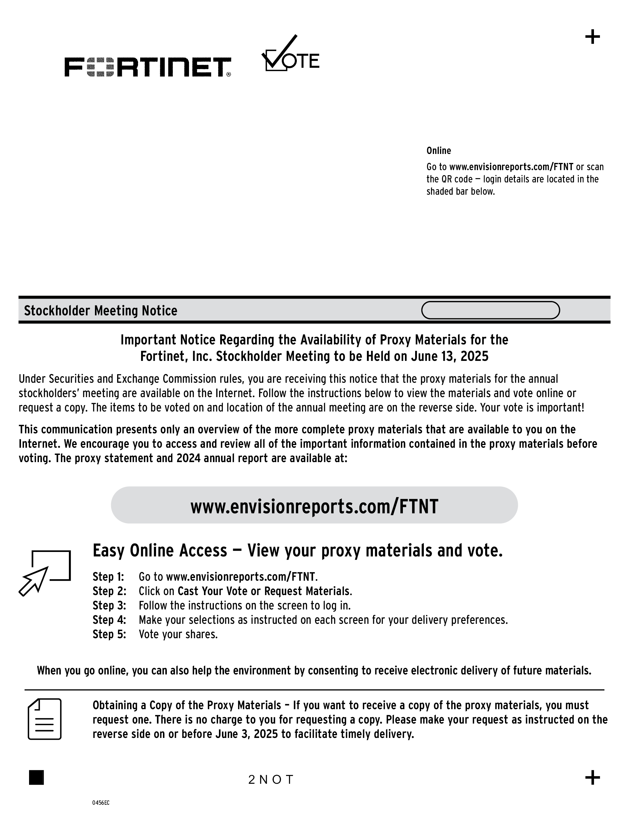 Online Go to www.envisionreports.com/FTNT or scan the QR code — login details are located in the shaded bar below. Stockholder Meeting Notice Important Notice Regarding the Availability of Proxy Materials for the Fortinet, Inc. Stockholder Meeting to be Held on June 13, 2025 Under Securities and Exchange Commission rules, you are receiving this notice that the proxy materials for the annual stockholders’ meeting are available on the Internet. Follow the instructions below to view the materials and vote online or request a copy. The items to be voted on and location of the annual meeting are on the reverse side. Your vote is important! This communication presents only an overview of the more complete proxy materials that are available to you on the Internet. We encourage you to access and review all of the important information contained in the proxy materials before voting. The proxy statement and 2024 annual report are available at: www.envisionreports.com/FTNT Step 1: Go to www.envisionreports.com/FTNT. Step 2: Click on Cast Your Vote or Request Materials. Step 3: Follow the instructions on the screen to log in. Easy Online Access — View your proxy materials and vote. Step 4: Make your selections as instructed on each screen for your delivery preferences. Step 5: Vote your shares. When you go online, you can also help the environment by consenting to receive electronic delivery of future materials. Obtaining a Copy of the Proxy Materials – If you want to receive a copy of the proxy materials, you must request one. There is no charge to you for requesting a copy. Please make your request as instructed on the reverse side on or before June 3, 2025 to facilitate timely delivery. 2 N O T 0456EC