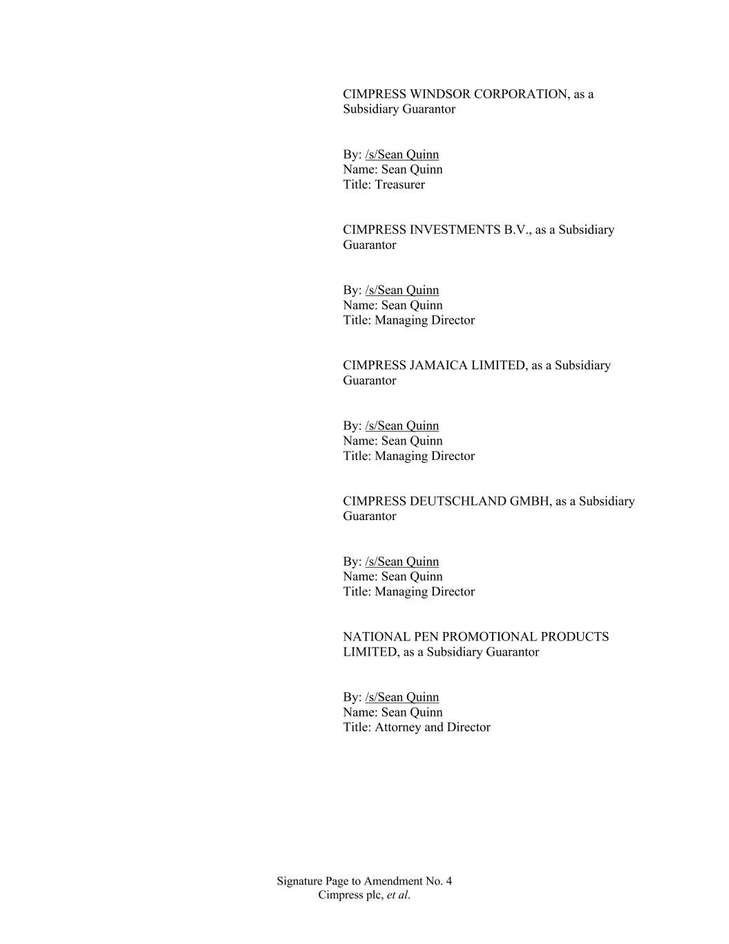 Signature Page to Amendment No. 4 Cimpress plc, et al. CIMPRESS WINDSOR CORPORATION, as a Subsidiary Guarantor By: /s/Sean Quinn Name: Sean Quinn Title: Treasurer CIMPRESS INVESTMENTS B.V., as a Subsidiary Guarantor By: /s/Sean Quinn Name: Sean Quinn Title: Managing Director CIMPRESS JAMAICA LIMITED, as a Subsidiary Guarantor By: /s/Sean Quinn Name: Sean Quinn Title: Managing Director CIMPRESS DEUTSCHLAND GMBH, as a Subsidiary Guarantor By: /s/Sean Quinn Name: Sean Quinn Title: Managing Director NATIONAL PEN PROMOTIONAL PRODUCTS LIMITED, as a Subsidiary Guarantor By: /s/Sean Quinn Name: Sean Quinn Title: Attorney and Director