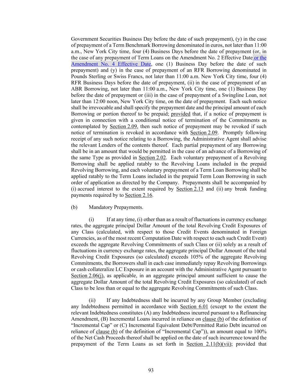 78 permitted by the terms of this Agreement, pursuant to a cashless settlement mechanism approved by the Company, the Administrative Agent and such Lender. ARTICLE II THE CREDITS SECTION 2.01 Commitments. (a) Prior to the Restatement Effective Date, certain revolving loans were made to the Borrowers under the Existing Credit Agreement which remain outstanding as of the Restatement Effective Date (such outstanding revolving loans being hereinafter referred to as the “Existing Loans”). Subject to the terms and conditions set forth in this Agreement, the Borrowers and each of the Revolving Lenders under the Existing Credit Agreement agree that on the Restatement Effective Date but subject to the reallocation and other transactions described in Section 1.06, the Existing Loans shall be reevidenced as Revolving Loans under this Agreement and the terms of the Existing Loans shall be restated in their entirety and shall be evidenced by this Agreement. (b) Subject to the terms and conditions set forth herein, each Lender (severally and not jointly) agrees to make Revolving Loans to the Borrowers in Agreed Currencies from time to time during the Availability Period in an aggregate principal amount that will not result (after giving effect to any application of proceeds of such Borrowing to any Swingline Loans outstanding pursuant to Section 2.10(a)) in, subject to Sections 2.04 and 2.11(b), (a) the Dollar Amount of such Lender’s Revolving Credit Exposure exceeding such Lender’s Commitment or (b) the Dollar Amount of the Total Revolving Credit Exposure exceeding the Aggregate Commitment. (c) Subject to the terms and conditions set forth herein (including, without limitation, Section 2.02): (i) each Term Lender with a Tranche B-1 Term Loan Commitment (severally and not jointly) agrees to make a Tranche B-1 Term Loan to the Initial Term Loan Borrowers in Dollars in a single drawing on the Restatement Effective Date, in an amount equal to such Term Lender’s Tranche B-1 Term Loan Commitment by making immediately available funds available to the Administrative Agent’s designated account, not later than the time specified by the Administrative Agent; and (ii) each Term Lender with a Tranche B-2 Term Loan Commitment (severally and not jointly) agrees to make a Tranche B-2 Term Loan to the Initial Term Loan Borrowers in euro in a single drawing on the Restatement Effective Date, in an amount equal to such Term Lender’s Tranche B-2 Term Loan Commitment by making immediately available funds available to the Administrative Agent’s designated account, not later than the time specified by the Administrative Agent. (d) Subject to the terms and conditions set forth herein (including, without limitation, Section 2.02), (i) each 2024 Refinancing Tranche B-1 Term Lender with a 2024 Refinancing Tranche B-1 Term Loan Commitment (severally and not jointly) agrees to make a 2024 Refinancing Tranche B-1 Term Loan to the Initial Term Loan Borrowers in Dollars in a single drawing on the Amendment No. 2 Effective Date, in an amount equal to such 2024 Refinancing Tranche B-1 Term Lender’s 2024 Refinancing Tranche B-1 Term Loan Commitment by making immediately available funds available to the Administrative Agent’s designated account, not later than the time specified by the Administrative Agent and (ii) each 2024 Converted Tranche B-1