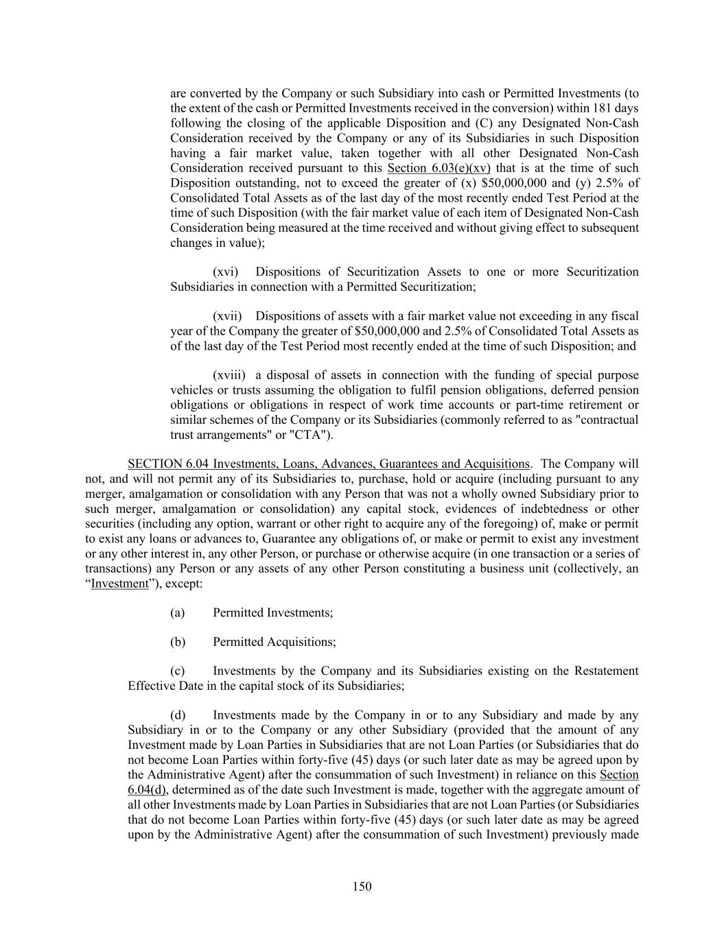 150 are converted by the Company or such Subsidiary into cash or Permitted Investments (to the extent of the cash or Permitted Investments received in the conversion) within 181 days following the closing of the applicable Disposition and (C) any Designated Non-Cash Consideration received by the Company or any of its Subsidiaries in such Disposition having a fair market value, taken together with all other Designated Non-Cash Consideration received pursuant to this Section 6.03(e)(xv) that is at the time of such Disposition outstanding, not to exceed the greater of (x) $50,000,000 and (y) 2.5% of Consolidated Total Assets as of the last day of the most recently ended Test Period at the time of such Disposition (with the fair market value of each item of Designated Non-Cash Consideration being measured at the time received and without giving effect to subsequent changes in value); (xvi) Dispositions of Securitization Assets to one or more Securitization Subsidiaries in connection with a Permitted Securitization; (xvii) Dispositions of assets with a fair market value not exceeding in any fiscal year of the Company the greater of $50,000,000 and 2.5% of Consolidated Total Assets as of the last day of the Test Period most recently ended at the time of such Disposition; and (xviii) a disposal of assets in connection with the funding of special purpose vehicles or trusts assuming the obligation to fulfil pension obligations, deferred pension obligations or obligations in respect of work time accounts or part-time retirement or similar schemes of the Company or its Subsidiaries (commonly referred to as "contractual trust arrangements" or "CTA"). SECTION 6.04 Investments, Loans, Advances, Guarantees and Acquisitions. The Company will not, and will not permit any of its Subsidiaries to, purchase, hold or acquire (including pursuant to any merger, amalgamation or consolidation with any Person that was not a wholly owned Subsidiary prior to such merger, amalgamation or consolidation) any capital stock, evidences of indebtedness or other securities (including any option, warrant or other right to acquire any of the foregoing) of, make or permit to exist any loans or advances to, Guarantee any obligations of, or make or permit to exist any investment or any other interest in, any other Person, or purchase or otherwise acquire (in one transaction or a series of transactions) any Person or any assets of any other Person constituting a business unit (collectively, an “Investment”), except: (a) Permitted Investments; (b) Permitted Acquisitions; (c) Investments by the Company and its Subsidiaries existing on the Restatement Effective Date in the capital stock of its Subsidiaries; (d) Investments made by the Company in or to any Subsidiary and made by any Subsidiary in or to the Company or any other Subsidiary (provided that the amount of any Investment made by Loan Parties in Subsidiaries that are not Loan Parties (or Subsidiaries that do not become Loan Parties within forty-five (45) days (or such later date as may be agreed upon by the Administrative Agent) after the consummation of such Investment) in reliance on this Section 6.04(d), determined as of the date such Investment is made, together with the aggregate amount of all other Investments made by Loan Parties in Subsidiaries that are not Loan Parties (or Subsidiaries that do not become Loan Parties within forty-five (45) days (or such later date as may be agreed upon by the Administrative Agent) after the consummation of such Investment) previously made