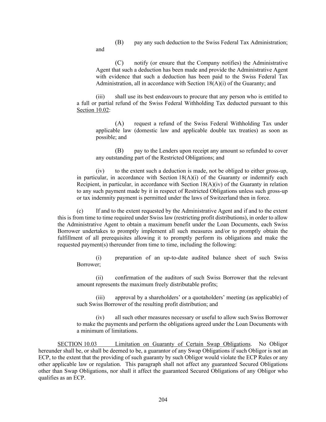 204 (B) pay any such deduction to the Swiss Federal Tax Administration; and (C) notify (or ensure that the Company notifies) the Administrative Agent that such a deduction has been made and provide the Administrative Agent with evidence that such a deduction has been paid to the Swiss Federal Tax Administration, all in accordance with Section 18(A)(i) of the Guaranty; and (iii) shall use its best endeavours to procure that any person who is entitled to a full or partial refund of the Swiss Federal Withholding Tax deducted pursuant to this Section 10.02: (A) request a refund of the Swiss Federal Withholding Tax under applicable law (domestic law and applicable double tax treaties) as soon as possible; and (B) pay to the Lenders upon receipt any amount so refunded to cover any outstanding part of the Restricted Obligations; and (iv) to the extent such a deduction is made, not be obliged to either gross-up, in particular, in accordance with Section 18(A)(i) of the Guaranty or indemnify each Recipient, in particular, in accordance with Section 18(A)(iv) of the Guaranty in relation to any such payment made by it in respect of Restricted Obligations unless such gross-up or tax indemnity payment is permitted under the laws of Switzerland then in force. (c) If and to the extent requested by the Administrative Agent and if and to the extent this is from time to time required under Swiss law (restricting profit distributions), in order to allow the Administrative Agent to obtain a maximum benefit under the Loan Documents, each Swiss Borrower undertakes to promptly implement all such measures and/or to promptly obtain the fulfillment of all prerequisites allowing it to promptly perform its obligations and make the requested payment(s) thereunder from time to time, including the following: (i) preparation of an up-to-date audited balance sheet of such Swiss Borrower; (ii) confirmation of the auditors of such Swiss Borrower that the relevant amount represents the maximum freely distributable profits; (iii) approval by a shareholders’ or a quotaholders’ meeting (as applicable) of such Swiss Borrower of the resulting profit distribution; and (iv) all such other measures necessary or useful to allow such Swiss Borrower to make the payments and perform the obligations agreed under the Loan Documents with a minimum of limitations. SECTION 10.03 Limitation on Guaranty of Certain Swap Obligations. No Obligor hereunder shall be, or shall be deemed to be, a guarantor of any Swap Obligations if such Obligor is not an ECP, to the extent that the providing of such guaranty by such Obligor would violate the ECP Rules or any other applicable law or regulation. This paragraph shall not affect any guaranteed Secured Obligations other than Swap Obligations, nor shall it affect the guaranteed Secured Obligations of any Obligor who qualifies as an ECP.