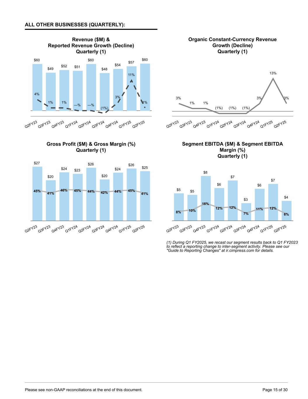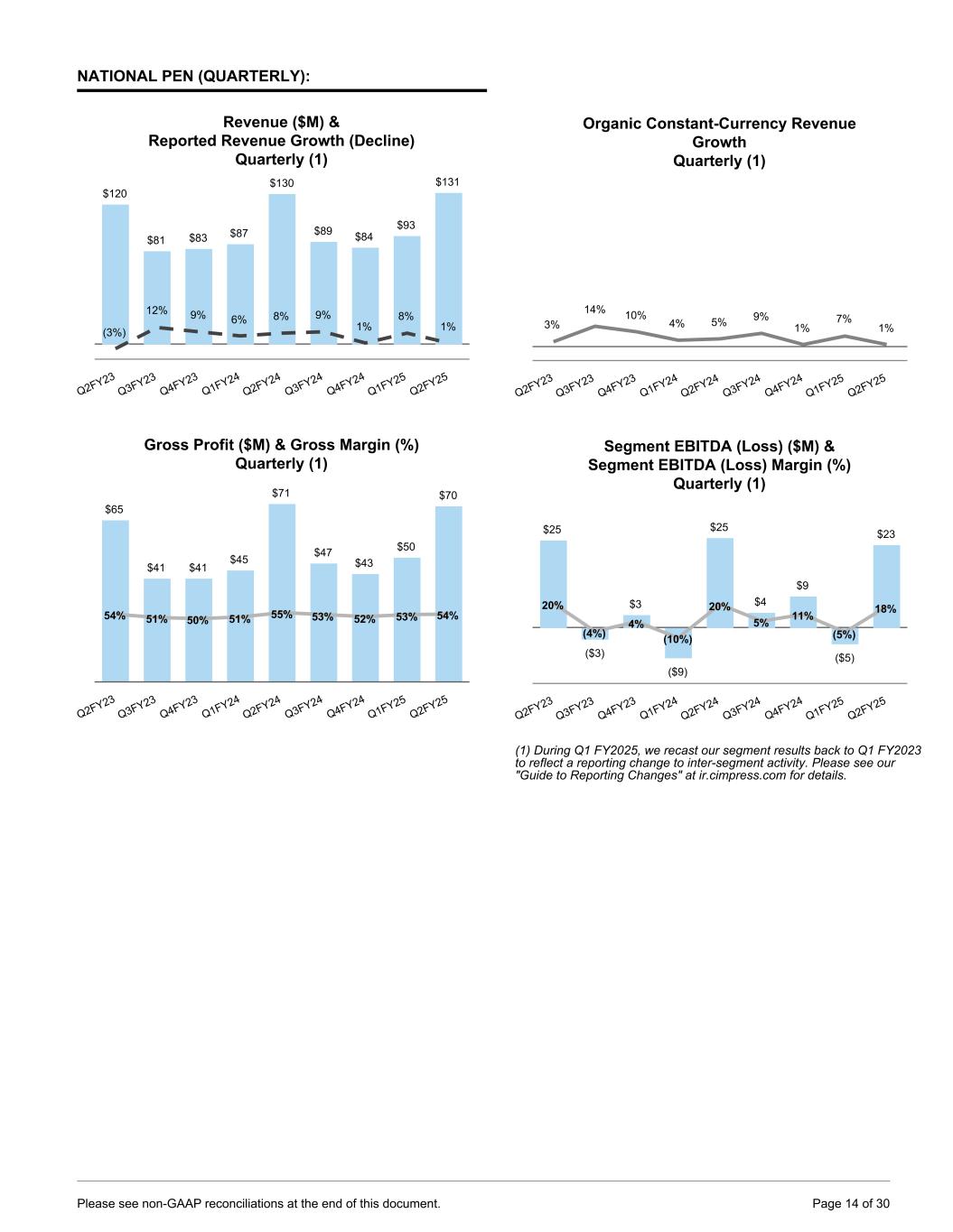 UPLOAD AND PRINT PRINTBROTHERS (QUARTERLY): Revenue ($M) & Reported Revenue Growth Quarterly (1) $149 $140 $158 $153 $166 $151 $171 $160 $175 8% 16% 10% 15% 11% 8% 8% 5% 5% Q2FY23 Q3FY23 Q4FY23 Q1FY24 Q2FY24 Q3FY24 Q4FY24 Q1FY25 Q2FY25 Organic Constant-Currency Revenue Growth Quarterly (1) 18% 22% 7% 6% 5% 6% 10% 4% 6% Q2FY23 Q3FY23 Q4FY23 Q1FY24 Q2FY24 Q3FY24 Q4FY24 Q1FY25 Q2FY25 Gross Profit ($M) & Gross Margin (%) Quarterly (1) $40 $36 $43 $42 $52 $43 $51 $45 $50 27% 26% 27% 27% 31% 29% 30% 28% 29% Q2FY23 Q3FY23 Q4FY23 Q1FY24 Q2FY24 Q3FY24 Q4FY24 Q1FY25 Q2FY25 Segment EBITDA ($M) & Segment EBITDA Margin (%) Quarterly (1) $20 $16 $21 $20 $29 $17 $25 $20 $23 13% 11% 13% 13% 17% 11% 15% 13% 13% Q2FY23 Q3FY23 Q4FY23 Q1FY24 Q2FY24 Q3FY24 Q4FY24 Q1FY25 Q2FY25 THE PRINT GROUP (QUARTERLY): Revenue ($M) & Reported Revenue Growth (Decline) Quarterly (1) $88 $85 $94 $79 $92 $87 $96 $84 $99 (2)% 12% 3% 4% 5% 3% 2% 6% 7% Q2FY23 Q3FY23 Q4FY23 Q1FY24 Q2FY24 Q3FY24 Q4FY24 Q1FY25 Q2FY25 0 Organic Constant-Currency Revenue Growth (Decline) Quarterly (1) 10% 18% 1% (3)% (1)% 2% 3% 4% 7% Q2FY23 Q3FY23 Q4FY23 Q1FY24 Q2FY24 Q3FY24 Q4FY24 Q1FY25 Q2FY25 Gross Profit ($M) & Gross Margin (%) Quarterly (1) $28 $30 $37 $29 $33 $33 $37 $32 $37 32% 35% 40% 36% 36% 38% 39% 38% 38% Q2FY23 Q3FY23 Q4FY23 Q1FY24 Q2FY24 Q3FY24 Q4FY24 Q1FY25 Q2FY25 Segment EBITDA ($M) & Segment EBITDA Margin (%) Quarterly (1) $12 $13 $20 $13 $17 $17 $19 $18 $19 14% 15% 21% 16% 19% 20% 20% 21% 19% Q2FY23 Q3FY23 Q4FY23 Q1FY24 Q2FY24 Q3FY24 Q4FY24 Q1FY25 Q2FY25 (1) During Q1 FY2025, we recast our segment results back to Q1 FY2023 to reflect a reporting change to inter-segment activity. Please see our "Guide to Reporting Changes" at ir.cimpress.com for details. Please see non-GAAP reconciliations at the end of this document. Page 13 of 30