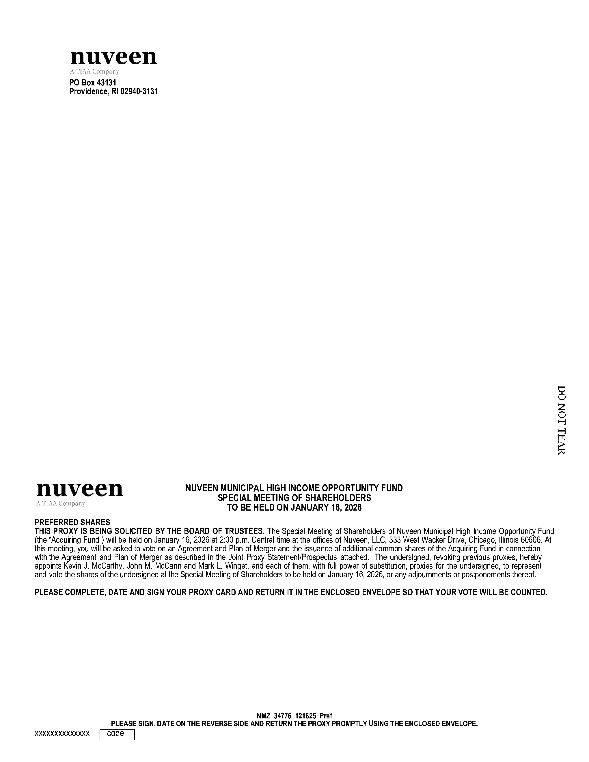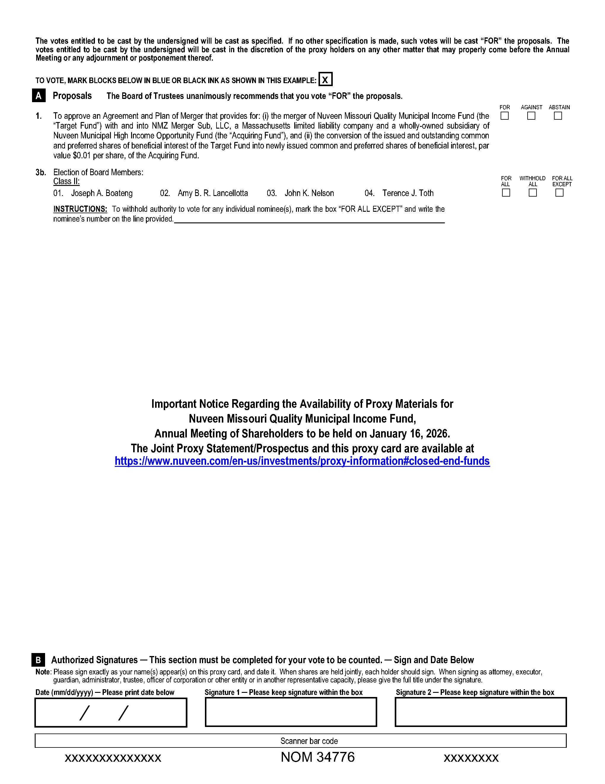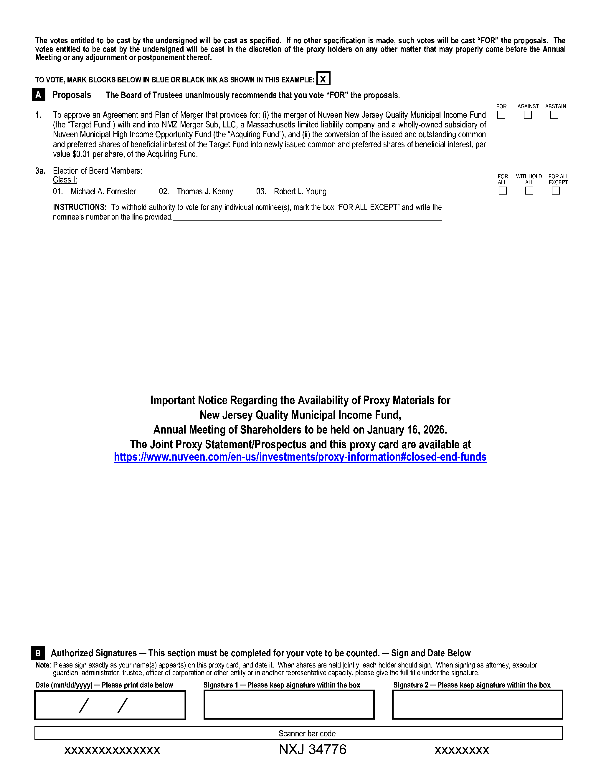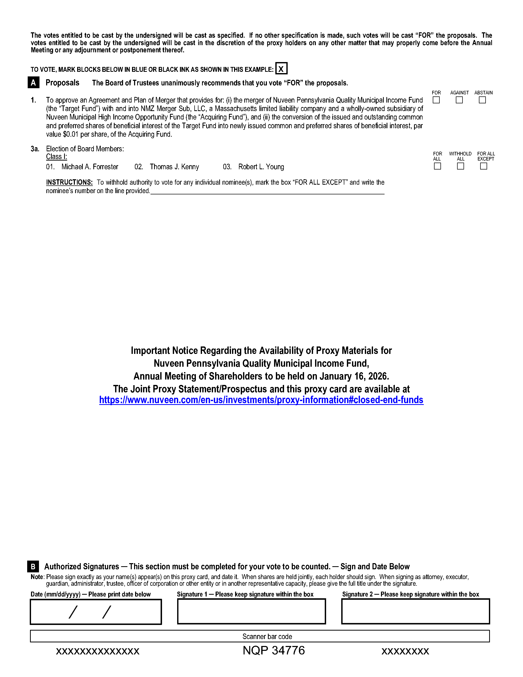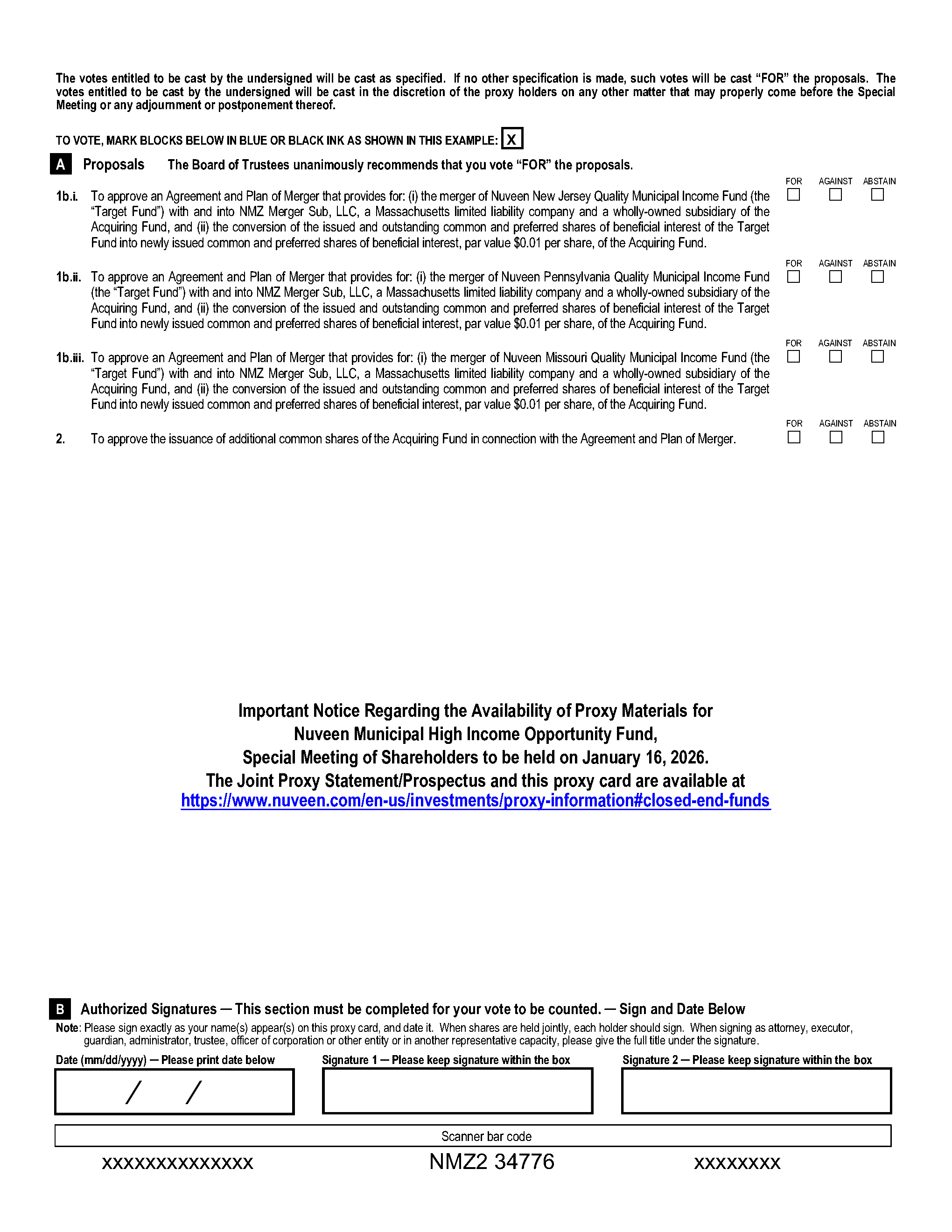 A.You are receiving the Joint Proxy Statement/Prospectus as a holder of common shares of Nuveen New Jersey Quality Municipal Income Fund (“New Jersey Municipal” or a “Target Fund”), Nuveen Pennsylvania Quality Municipal Income Fund (“Pennsylvania Municipal” or a “Target Fund”), or Nuveen Missouri Quality Municipal Income Fund (“Missouri Municipal” or a “Target Fund”) or as a holder of common or preferred shares of Nuveen Municipal High Income Opportunity Fund (the “Acquiring Fund” and together with the Target Funds, the “Funds” or each individually, a “Fund”) in connection with the solicitation of proxies by each Fund’s Board of Trustees (each, a “Board” and each Trustee, a “Board Member”) for use at the annual meetings of shareholders of New Jersey Municipal, Pennsylvania Municipal, and Missouri Municipal and at the special meeting of shareholders of the Acquiring Fund (each, a “Meeting” and together, the “Meetings”).