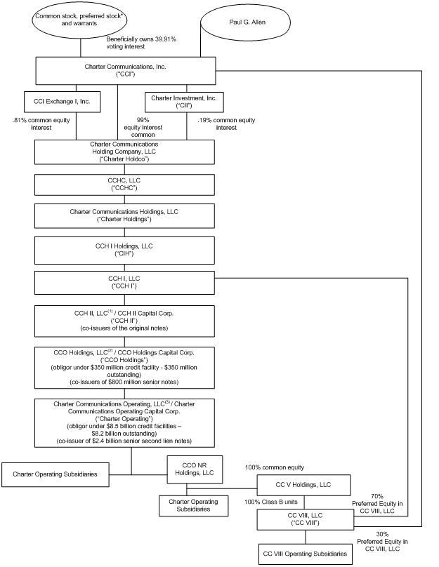 In November 2003 and August 2005, CCO Holdings and CCO Holdings Capital Corp. jointly issued $500 million and $300 million, respectively, total principal amount of 8¾% senior notes due 2013 (the “CCOH 2013 Notes”). The CCOH 2013 Notes are senior debt obligations of CCO Holdings and CCO Holdings Capital Corp. They rank equally with all other current and future unsecured, unsubordinated obligations of CCO Holdings and CCO Holdings Capital Corp. The CCOH 2013 Notes are structurally subordinated to all obligations of subsidiaries of CCO Holdings, including the Charter Operating notes and the Charter Operating credit facilities.