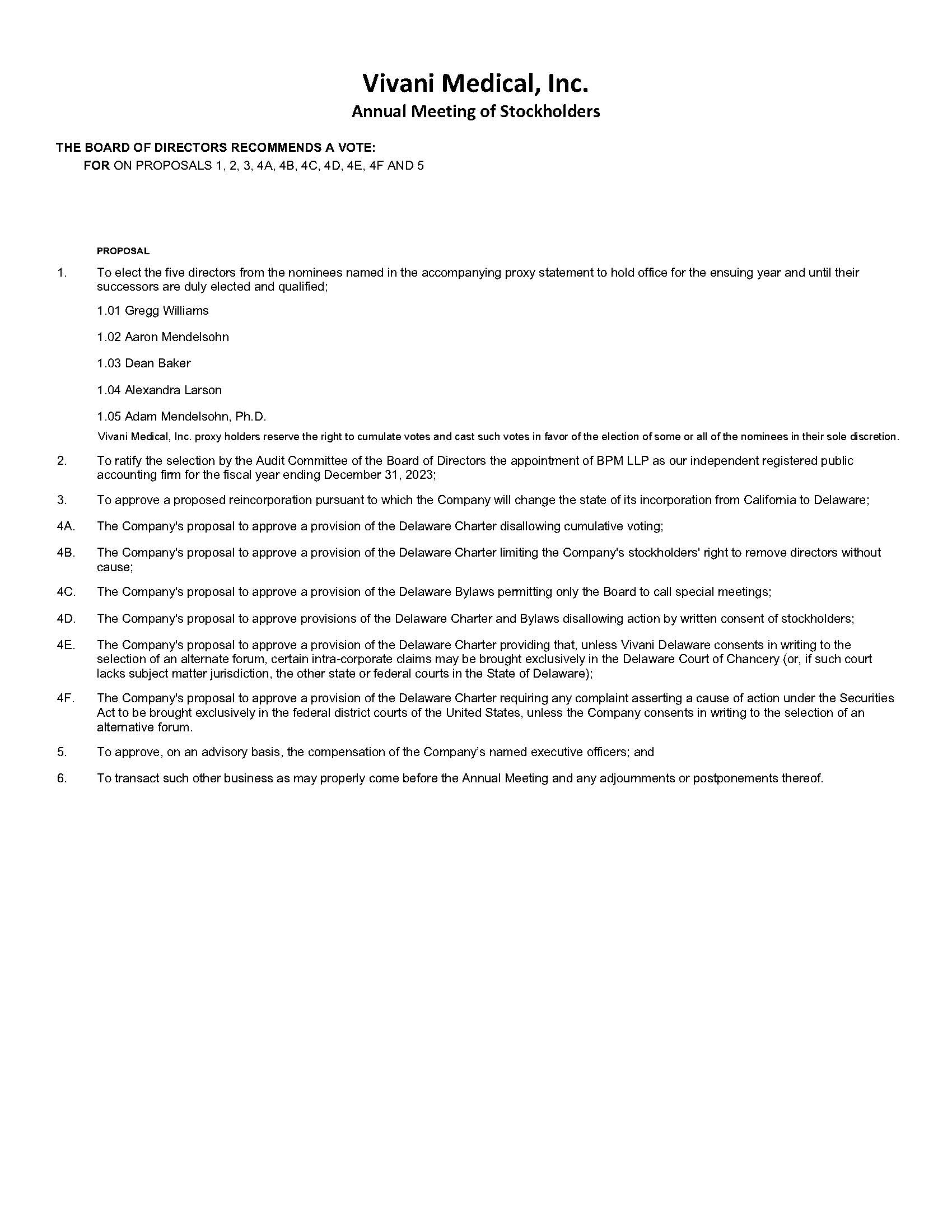 You are cordially invited to attend the Annual Meeting of Stockholders (the “Annual Meeting”) of Vivani Medical, Inc., a California corporation (the “Company”), on June 15, 2023, at 10:00 a.m. Pacific Time. The Annual Meeting will be held entirely online live via audio webcast. You will be able to attend and participate in the Annual Meeting online by visiting www.proxydocs.com/VANI, where you will be able to listen to the Annual Meeting live, submit questions, and vote. There will not be a physical location for the Annual Meeting. The Annual Meeting will be held for the following purposes: