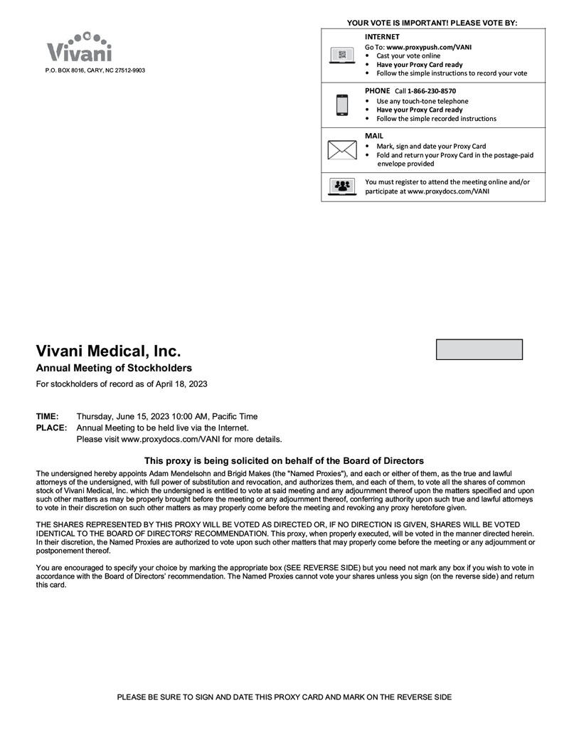 It is my pleasure to invite you to attend Vivani Medical, Inc.’s 2023 Annual Meeting of Stockholders (the “Annual Meeting”), to be held on June 15, 2023, at 10:00 a.m. Pacific Time. The Annual Meeting will be held entirely online live via audio webcast. You will be able to attend and participate in the Annual Meeting online by first registering at www.proxydocs.com/VANI, where you will be able to listen to the Annual Meeting live, submit questions and vote.