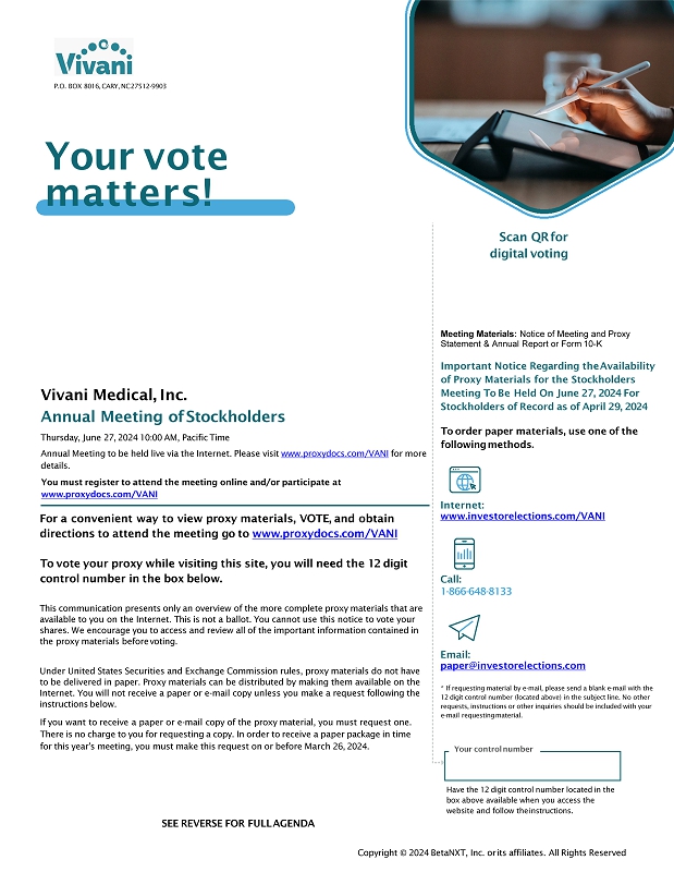 Your control number Your vote matters! Meeting Materials: Notice of Meeting and Proxy Statement & Annual Report or Form 10 - K Important Notice Regarding the Availability of Proxy Materials for the Stockholders Meeting To Be Held On June 27, 2024 For Stockholders of Record as of April 29, 2024 To order paper materials, use one of the following methods. Internet: www.investorelections.com/VANI Call: 1 - 866 - 648 - 8133 Email: paper@inves t orelections . com * If requesting material by e - mail, please send a blank e - mail with the 12 digit control number (located above) in the subject line. No other requests, instructions or other inquiries should be included with your e - mail requesting material. Vivani Medical, Inc. Annual Meeting of Stockholders Thursday, June 27, 2024 10:00 AM, Pacific Time Annual Meeting to be held live via the Internet. Please visit www.proxydocs.com/VANI for more details. You must register to attend the meeting online and/or participate at www.proxydocs.com/VANI For a convenient way to view proxy materials, VOTE, and obtain directions to attend the meeting go to www.proxydocs.com/VANI To vote your proxy while visiting this site, you will need the 12 digit control number in the box below. This communication presents only an overview of the more complete proxy materials that are available to you on the Internet. This is not a ballot. You cannot use this notice to vote your shares. We encourage you to access and review all of the important information contained in the proxy materials before voting. Under United States Securities and Exchange Commission rules, proxy materials do not have to be delivered in paper . Proxy materials can be distributed by making them available on the Internet . You will not receive a paper or e - mail copy unless you make a request following the instructions below . If you want to receive a paper or e - mail copy of the proxy material, you must request one. There is no charge to you for requesting a copy. In order to receive a paper package in time for this year's meeting, you must make this request on or before March 26, 2024. P.O. BOX 8016, CARY, NC 27512 - 9903 Have the 12 digit control number located in the box above available when you access the website and follow the instructions. SEE REVERSE FOR FULL AGENDA Copyright © 2024 BetaNXT, Inc. or its affiliates. All Rights Reserved Scan QR for digital voting