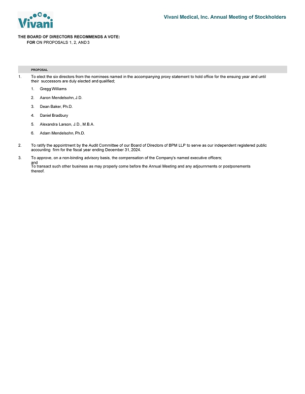 PROPOSAL 1. To elect the six directors from the nominees named in the accompanying proxy statement to hold office for the ensuing year and until their successors are duly elected and qualified; 1. Gregg Williams 2. Aaron Mendelsohn, J.D. 3. Dean Baker, Ph.D. 4. Daniel Bradbury 5. Alexandra Larson, J.D., M.B.A. 6. Adam Mendelsohn, Ph.D. 2. To ratify the appointment by the Audit Committee of our Board of Directors of BPM LLP to serve as our independent registered public accounting firm for the fiscal year ending December 31, 2024. 3. To approve, on a non - binding advisory basis, the compensation of the Company's named executive officers; and To transact such other business as may properly come before the Annual Meeting and any adjournments or postponements thereof. THE BOARD OF DIRECTORS RECOMMENDS A VOTE: FOR ON PROPOSALS 1, 2, AND 3 Vivani Medical, Inc. Annual Meeting of Stockholders