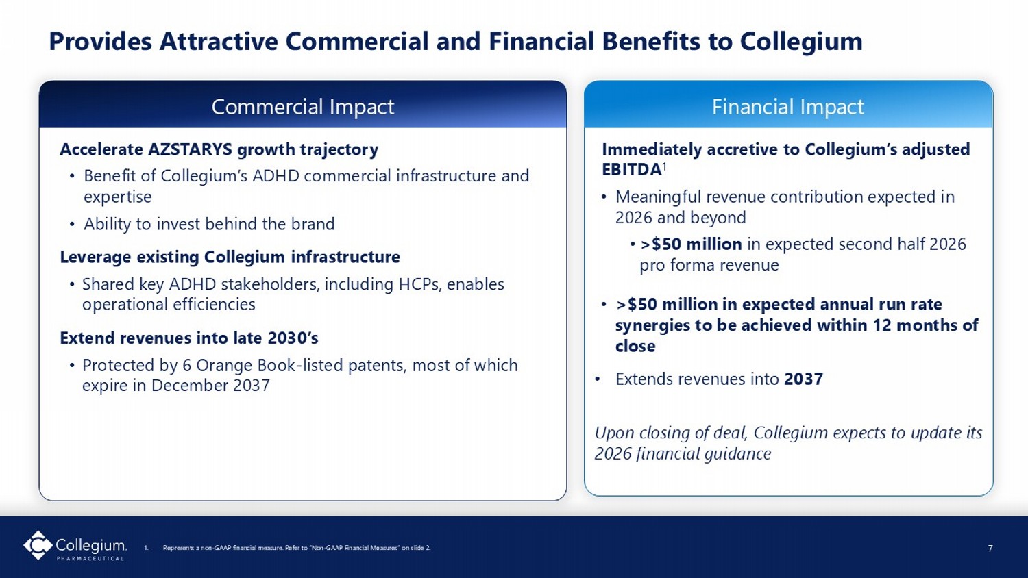 TIMING: Expected to close in Q2 2026 Purchase Price Transaction and Financial Details 1 • $650 million in cash • Up to $135 million in potential milestone payments based on future commercial and regulatory milestones 6 Funding for Acquisition • $350 million cash on hand • $300 million delayed draw term loan Capital Impact • Net debt to adjusted EBITDA 2 expected to be approximately 2x at deal close • Expect to rapidly pay down debt from future cash from operations 1. Unless otherwise noted, based on financial data provided by Collegium in its press release on Form 8 - K filed with the SEC on Mar ch 19, 2026. 2. Represents a non - GAAP financial measure. Refer to “Non - GAAP Financial Measures” on slide 2. Net debt/adjusted EBITDA is calcula ted based on financial data provided by Collegium in its press release on Form 8 - K filed with the SEC on March 19, 2026 and Annual Report on Form 10 - K filed with the SEC on February 26, 2026.