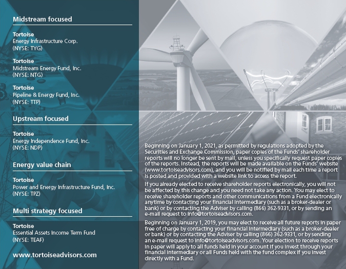 Tortoise Pipeline & Energy Fund, Inc. (“TTP”) and Tortoise Power and Energy Infrastructure Fund, Inc. (“TPZ”) are relying on exemptive relief permitting them to make long-term capital gain distributions throughout the year. Each of TTP and TPZ, with approval of its Board of Directors (the “Board”), has adopted a distribution policy (the “Policy”) with the purpose of distributing over the course of each year, through periodic distributions as nearly equal as practicable and any required special distributions, an amount closely approximating the total taxable income of TTP and TPZ during such year and, if so determined by the Board, all or a portion of the return of capital paid by portfolio companies to TTP and TPZ during such year. In accordance with its Policy, TTP distributes a fixed amount per common share, currently $0.285, each quarter to its common shareholders. Prior to August 2019, the quarterly distribution rate was $0.4075. TPZ distributes a fixed amount per common share, currently $0.125, each month to its common shareholders. These amounts are subject to change from time to time at the discretion of the Board. Although the level of distributions is independent of TTP’s and TPZ’s performance, TTP and TPZ expect such distributions to correlate with its performance over time. Each quarterly and monthly distribution to shareholders is expected to be at the fixed amount established by the Board, except for extraordinary distributions in light of TTP’s and TPZ’s performance for the entire calendar year and to enable TTP and TPZ to comply with the distribution requirements imposed by the Internal Revenue Code. The Board may amend, suspend or terminate the Policy without prior notice to shareholders if it deems such action to be in the best interests of TTP, TPZ and their respective shareholders. For example, the Board might take such action if the Policy had the effect of shrinking TTP’s or TPZ’s assets to a level that was determined to be detrimental to TTP or TPZ shareholders. The suspension or termination of the Policy could have the effect of creating a trading discount (if TTP’s or TPZ’s stock is trading at or above net asset value), widening an existing trading discount, or decreasing an existing premium. You should not draw any conclusions about TTP’s or TPZ’s investment performance from the amount of the distribution or from the terms of TTP’s or TPZ’s distribution policy. Each of TTP and TPZ estimates that it has distributed more than its income and net realized capital gains; therefore, a portion of your distribution may be a return of capital. A return of capital may occur, for example, when some or all of the money that you invested in TTP or TPZ is paid back to you. A return of capital distribution does not necessarily reflect TTP’s or TPZ’s investment performance and should not be confused with “yield” or “income.” The amounts and sources of distributions reported are only estimates and are not being provided for tax reporting purposes. The actual amounts and sources of the amounts for tax reporting purposes will depend upon TTP’s and TPZ’s investment experience during the remainder of their fiscal year and may be subject to changes based on tax regulations. TTP and TPZ will send you a Form 1099-DIV for the calendar year that will tell you how to report these distributions for federal income tax purposes.