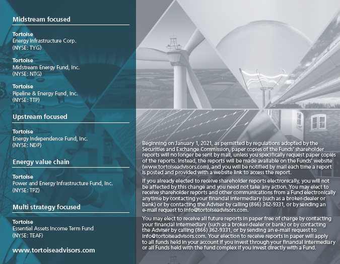 Tortoise Pipeline & Energy Fund, Inc. (“TTP”) and Tortoise Power and Energy Infrastructure Fund, Inc. (“TPZ”) are relying on exemptive relief permitting them to make long-term capital gain distributions throughout the year. Each of TTP and TPZ, with approval of its Board of Directors (the “Board”), has adopted a distribution policy (the “Policy”) with the purpose of distributing over the course of each year, through periodic distributions as nearly equal as practicable and any required special distributions, an amount closely approximating the total taxable income of TTP and TPZ during such year and, if so determined by the Board, all or a portion of the return of capital paid by portfolio companies to TTP and TPZ during such year. In accordance with its Policy, TTP distributes a fixed amount per common share, currently $0.285, each quarter to its common shareholders. Prior to August 2019, the quarterly distribution rate was $0.4075. TPZ distributes a fixed amount per common share, currently $0.125, each month to its common shareholders. These amounts are subject to change from time to time at the discretion of the Board. Although the level of distributions is independent of TTP’s and TPZ’s performance, TTP and TPZ expect such distributions to correlate with its performance over time. Each quarterly and monthly distribution to shareholders is expected to be at the fixed amount established by the Board, except for extraordinary distributions in light of TTP’s and TPZ’s performance for the entire calendar year and to enable TTP and TPZ to comply with the distribution requirements imposed by the Internal Revenue Code. The Board may amend, suspend or terminate the Policy without prior notice to shareholders if it deems such action to be in the best interests of TTP, TPZ and their respective shareholders. For example, the Board might take such action if the Policy had the effect of shrinking TTP’s or TPZ’s assets to a level that was determined to be detrimental to TTP or TPZ shareholders. The suspension or termination of the Policy could have the effect of creating a trading discount (if TTP’s or TPZ’s stock is trading at or above net asset value), widening an existing trading discount, or decreasing an existing premium. You should not draw any conclusions about TTP’s or TPZ’s investment performance from the amount of the distribution or from the terms of TTP’s or TPZ’s distribution policy. Each of TTP and TPZ estimates that it has distributed more than its income and net realized capital gains; therefore, a portion of your distribution may be a return of capital. A return of capital may occur, for example, when some or all of the money that you invested in TTP or TPZ is paid back to you. A return of capital distribution does not necessarily reflect TTP’s or TPZ’s investment performance and should not be confused with “yield” or “income.” The amounts and sources of distributions reported are only estimates and are not being provided for tax reporting purposes. The actual amounts and sources of the amounts for tax reporting purposes will depend upon TTP’s and TPZ’s investment experience during the remainder of their fiscal year and may be subject to changes based on tax regulations. TTP and TPZ will send you a Form 1099-DIV for the calendar year that will tell you how to report these distributions for federal income tax purposes.